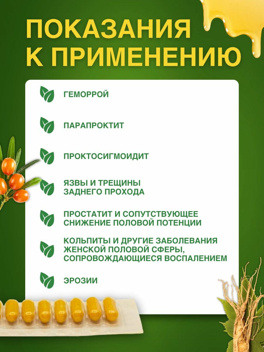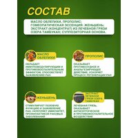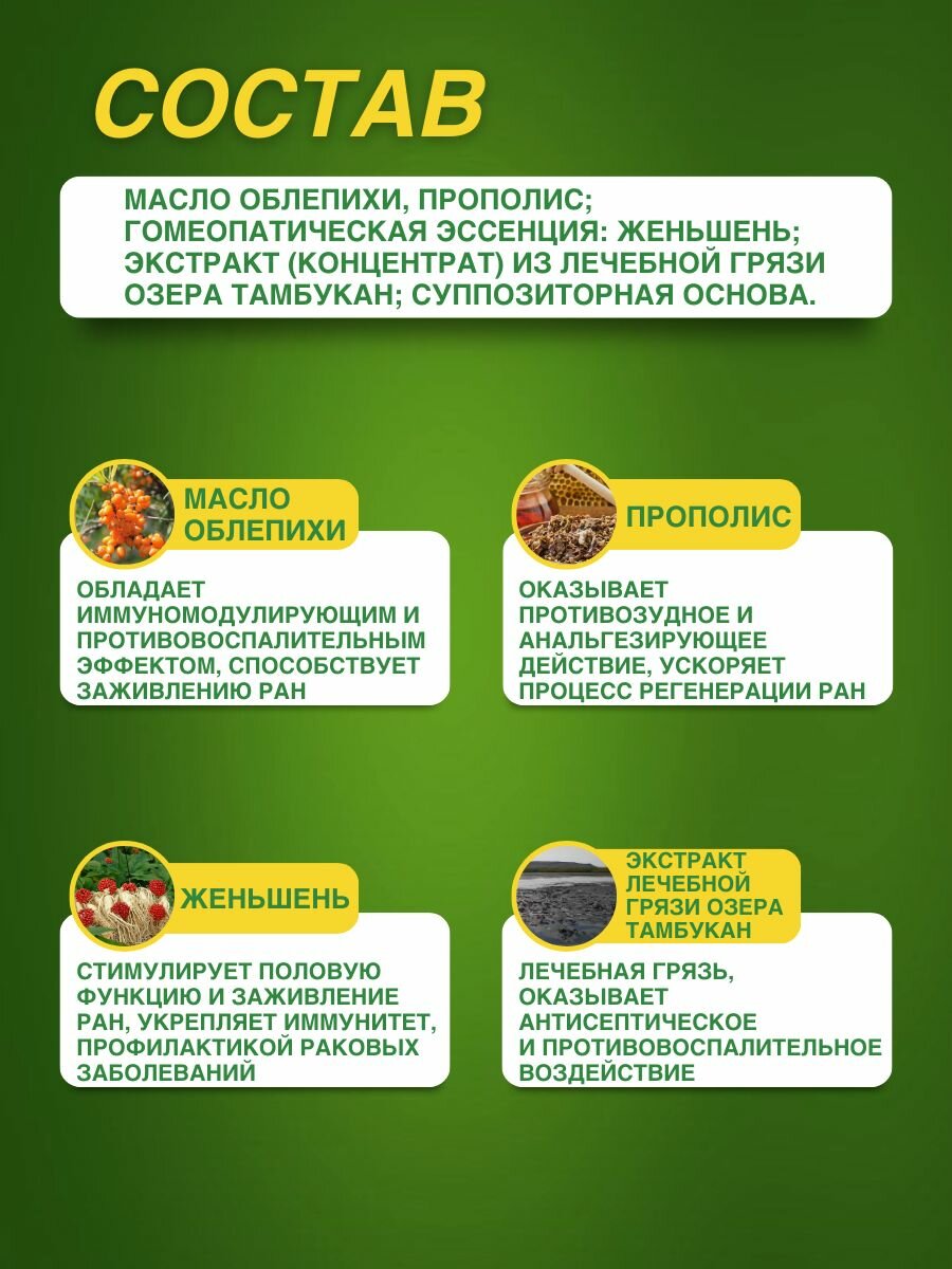 Показания к применению и фармакологические свойства отдельных компонентов: прополис оригинальная технология приготовления обеспечивает активное всасывание следствием чего является не только поверхностное, но и внутритканевое многоплановое действие: антимикробное, противогрибковое, местное обезболивающее, противовоспалительное, ранозаживляющее, адаптогенное и противозудное. Убивает микробов, устраняет различные признаки и симптомы воспаления, такие как: краснота, отечность, боль и др. Повышает потенцию. Кольпиты, бели, эрозия, метрит, эндометрит, параметрит, аднексит, геморрой, трещины, язвы, простатиты. Масло облепихи Язва желудка. Язва двенадцатиперстной кишки. Воспалительные болезни шейки матки. Воспалительные болезни влагалища и вульвы. Эрозия и эктропион шейки матки регенерирующее-стимулирует репаративние процессы(ускоряет эпителизацию) при поражения слизистой оболочки прямой кишки и влагалища различной этимологии. Способствует заживлению трудно заживающих ран, наружных и внутренних язв, ожогов выводит из организма сопи тяжелых металлов; повышает эластичность кровеносных сосудов, обладает антисклеротическим действием; улучшает работу сердечно-сосудистой системы; нормализует жировой белковый и холестериновый обмены; положительно влияет на функцию щитовидной железы; нормализует работу печени, повышает потенцию. Гинзенг адаптогенное, тонизирующее при умственном и физическом переутомлении, стимулирует секрецию желёз, воздействует на нижние отделы спинного мозга. Повышает потенцию. Слабость гениталиев, Сладострастное щекотание в конце уретры, Половое возбуждение без возможности его реализации. Ощущение давления в яичках. Тугоподвижность спины, контрактуры суставов, хруст в суставах. Экстракт (концентрат) из грязи озера Тамбукан противовоспалительное(оказывает влияние на обе фазы воспалительного процесса), ранозаживляющее, регенерирующее, иммунокорректирующее, мощное антимикробное действие. Геморрой, воспалительные заболевания мочеполовой системы, повреждения слизистых оболочек, трудно заживающие раны, язвы, трещины.