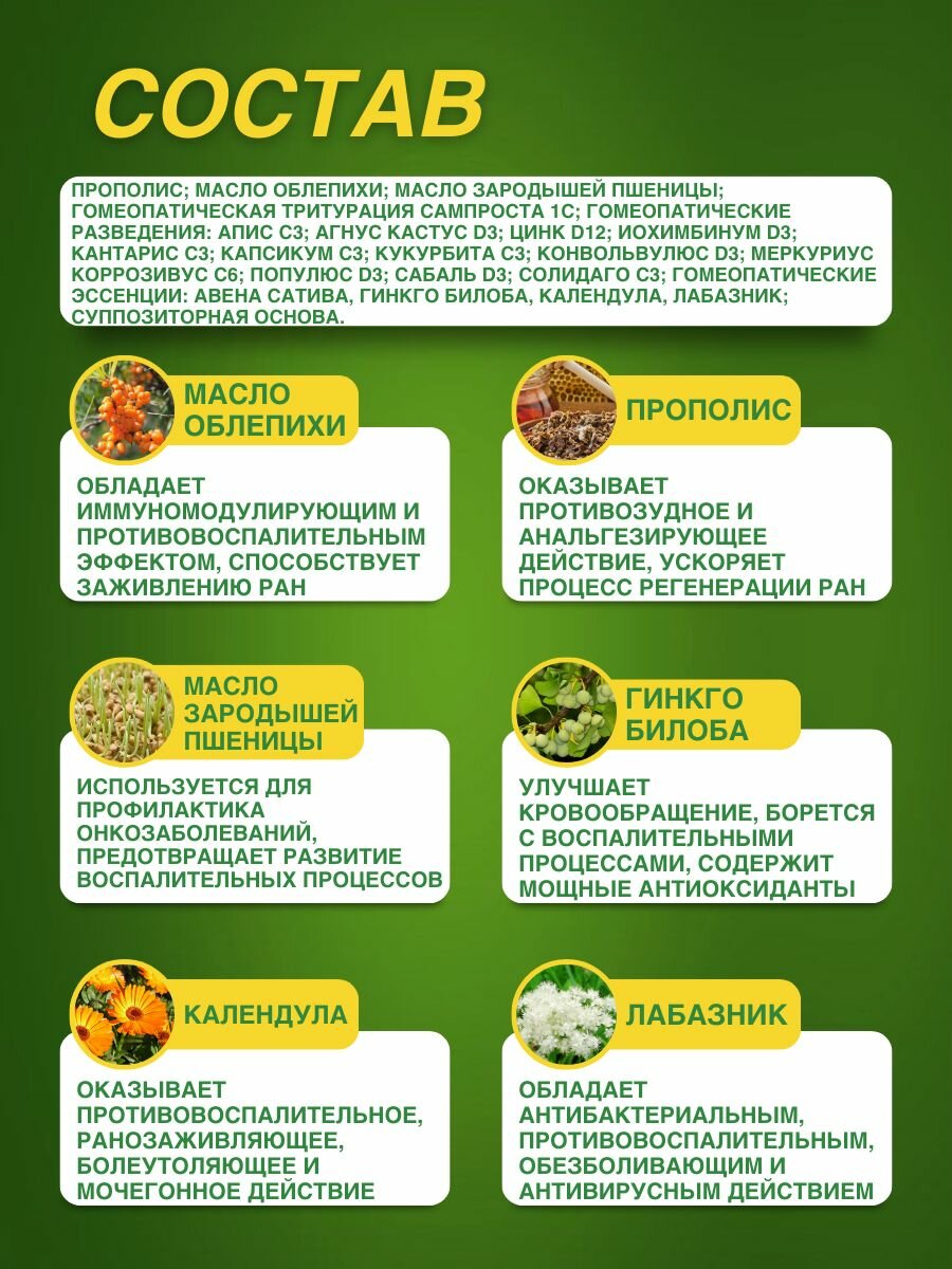 Лекарство для поддержания мужского здоровья состоит из органических природных компонентов, таких как регенерирующее масло облепихи, питающее и смягчающее масло какао и экстракты календулы, прополиса и целебной грязи озера Тамбукан. Снимает раздражения и воспаления. Все эти элементы имеют оздоровительный эффект на кожу и слизистые оболочки. Не содержит глицерин, нефть и продукты ее переработки, парабены и силиконы. Упаковка обеспечивает сохранность без применения химических консервантов и удобна в использовании. Лещина оказывает вяжущее противодизентерийное действие, а также сосудосуживающее, жаропонижающее и противовоспалительное. Укрепляет стенки кровеносных сосудов. Применяется в комплексе и профилактике аденомы и простатита. Крапива способствует обмену веществ. Помогает при туберкулезе, подагре и анемии. Средство используется при атеросклерозе, заболевании печени и желчных путей. Тыквы обладает афродизиатическими свойствами, улучшает потенцию. Повышает количество сперматозоидов и увеличивает их активность. Медицинские показания суппозитории: урологические нарушения функций мочевыделительной и половой системы. В интимной зоне опухание полового члена и яичек, атрофия, боль и жжение. Эректильная дисфункция, болезненные эрекции, потенции. Затруднительное или нарушенное мочеиспускание. Хронические заболевание почек и мочевого пузыря. Способ применения: в область вульвы или ректально в прямую кишку. Подробная инструкция внутри коробки. Косметика и уход для долголетия. Производитель ООО адонис центр научно-практической гомеопатии и традиционной медицины. Россия город Пятигорск. Одобрено министерством здравоохранения.