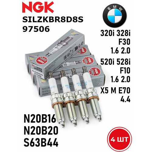 Иридиевые свечи зажигания NGK 97506 SILZKBR8D8S – это комплект из четырех высококачественных свечей, предназначенных для использования в автомобилях BMW и Toyota, включая популярные модели, такие как BMW 1, 2, 3, 4, 5; X1, X3, X4, X5, X6 и Z4, а также Toyota Celica Supra XX c двигателями N20B20A, N20B20B, N20B20C, N20B20D, N26B20A, N63B44B и S63B44A