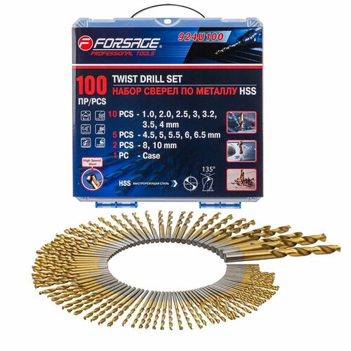 Набор сверл по металлу 100 предметов в пластиковом кейсе от бренда FORSAGE - это набор спиральных свёрл, предназначенных для сверления отверстий в металлических изделиях.