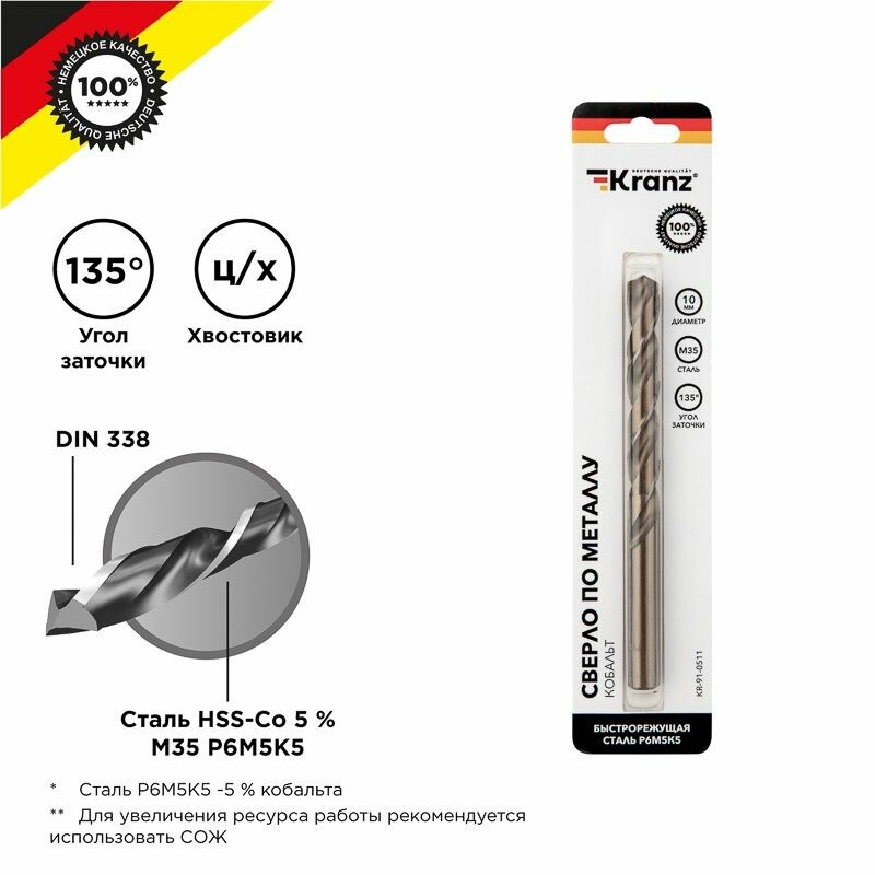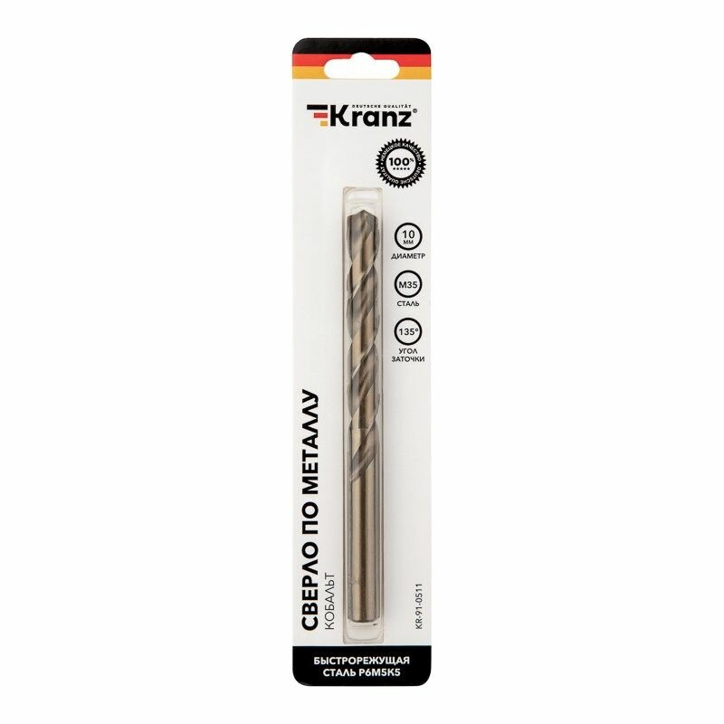 Сверло по металлу 10х133х87мм Кобальт (сталь HSS-Co 5% M35 P6M5K5) DIN 338, 1 шт. в блистере KRANZ: сравнение цен, характеристики, фото, актуальное наличие и цены.
