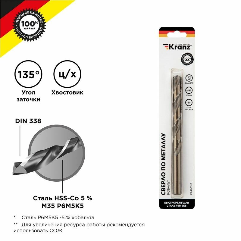 Сверло по металлу 12х151х101мм Кобальт (сталь HSS-Co 5 % M35 P6M5K5) DIN 338, 1 шт. в блистере KRANZ: сравнение цен, характеристики, фото, актуальное наличие и цены.