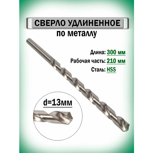 Сверло по металлу удлиненное Размер: Диаметр:13мм Длина общая: 300мм Применение: Для сверления отверстий в металле. Материал: быстрорежущая сталь (HSS) с поверхностным упрочнением нитрида титана. Особенности: Покрытие нитридом титана существенно повышает ресурс инструмента. Имеет проточку в основании, для использования с электроинструментом, на котором установлены патроны меньшего диаметра.