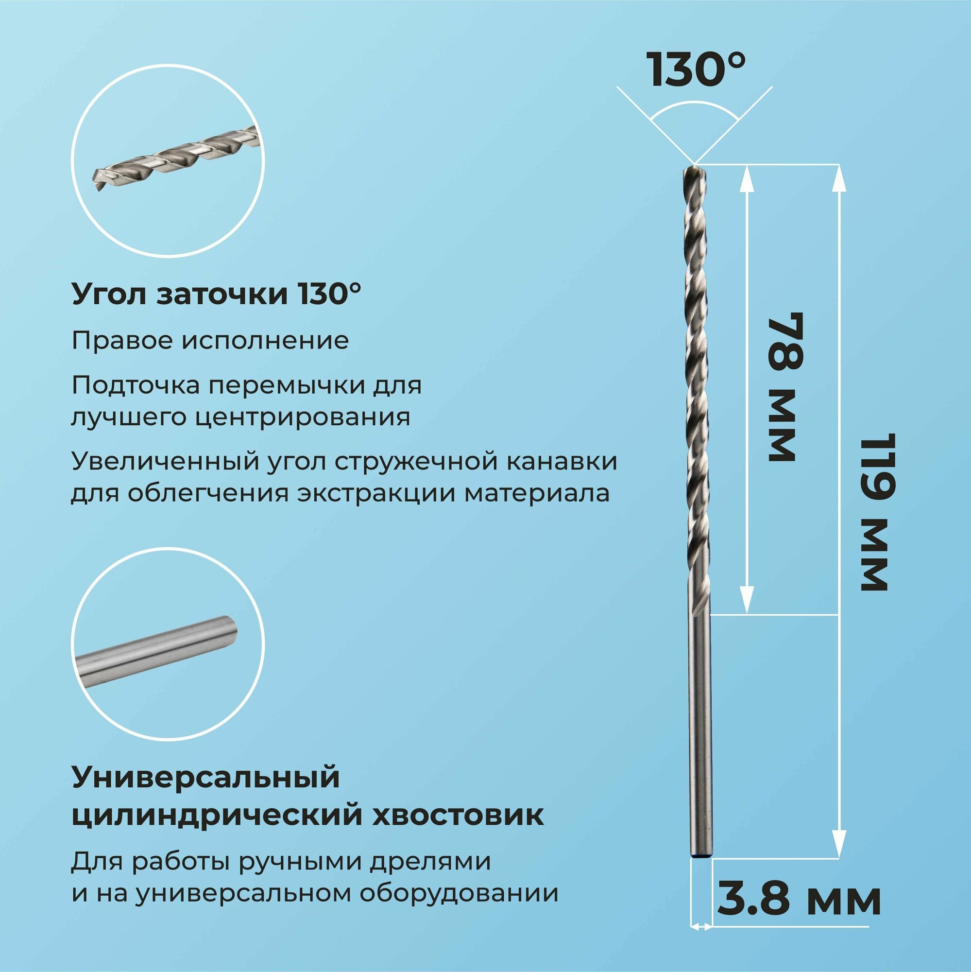Сверло по металлу 3.8 мм NORGAU Industrial из быстрорежущей HSS-E (Co5%) стали, удлиненное, тип VA правое, DIN 340: сравнение цен, характеристики, фото, актуальное наличие и цены.