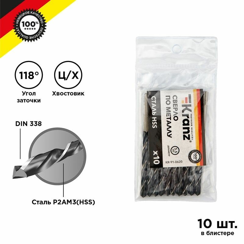 Сверло по металлу 5,5х93х57мм (HSS), DIN 338, 10 шт. в упаковке KRANZ: сравнение цен, характеристики, фото, актуальное наличие и цены.