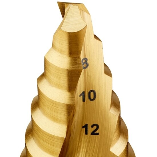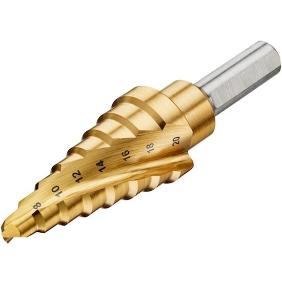 Ступенчатое сверло по металлу профессиональной серии EXTREME™ с титановым покрытием для снижения нагрева при сверлении и дополнительной защиты от коррозии. Фирменная форма наконечника Split Point обеспечивает эффективное сверление и долгий срок службы. Улучшенная геометрия с двумя канавками для отвода металлической стружки. Лазерная гравировка размеров. Универсальный хвостовик конической формы 9 мм. Сверло DeWALT DT90248-QZ применяется для сверления листовой нержавеющей стали толщиной до 5 мм, металла, древесины и пластика. Шаг: 6 / 8 / 10 / 12 / 14 / 16 / 18 / 20 мм. Поставляется в фирменной блистерной упаковке. 1