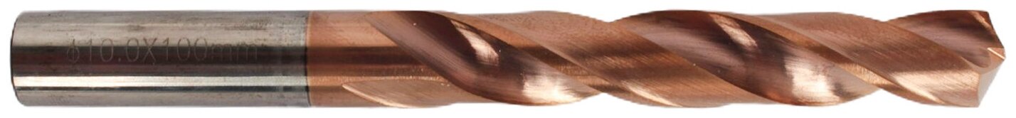 Сверло спиральное твердосплавное правое Назначение: для сверления отверстий в различных материалах, рассверливания (увеличения просверленных отверстий) и засверливания (получение сквозных углублений). Вид сверла: спиральное, монолитное Тип охлаждения: внешний Тип хвостовика: цилиндрический Общая длина: 100мм Рабочий диаметр: 10мм Длина рабочей части: 65мм Диаметр хвостовика: 10мм Материал сверла: сплав карбида вольфрама, с напылением нитрида титана на рабочей части. Подходит для сверления yглеродистой стали, легированной стали, нержавеющей стали. Возможное применение с подбором режимов сверления и охлаждения СОЖ: инструментальная сталь, чугун.