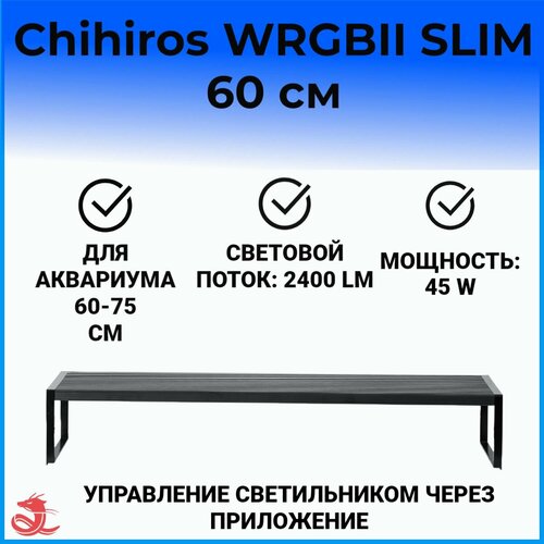 Светильник Chihiros aquatic studio WRGB II SLIM 60 см - это светильник с новым дизайном радиатора (корпуса), RGB-светодиодами и Bluetooth контроллером. В отличие от серии светильников Chihiros aquatic studio WRGB II, серия светильников Chihiros aquatic studio WRGB II SLIM имеет меньшую мощность и подходит для аквариумов с растениями, которые не требуют сильного освещения.