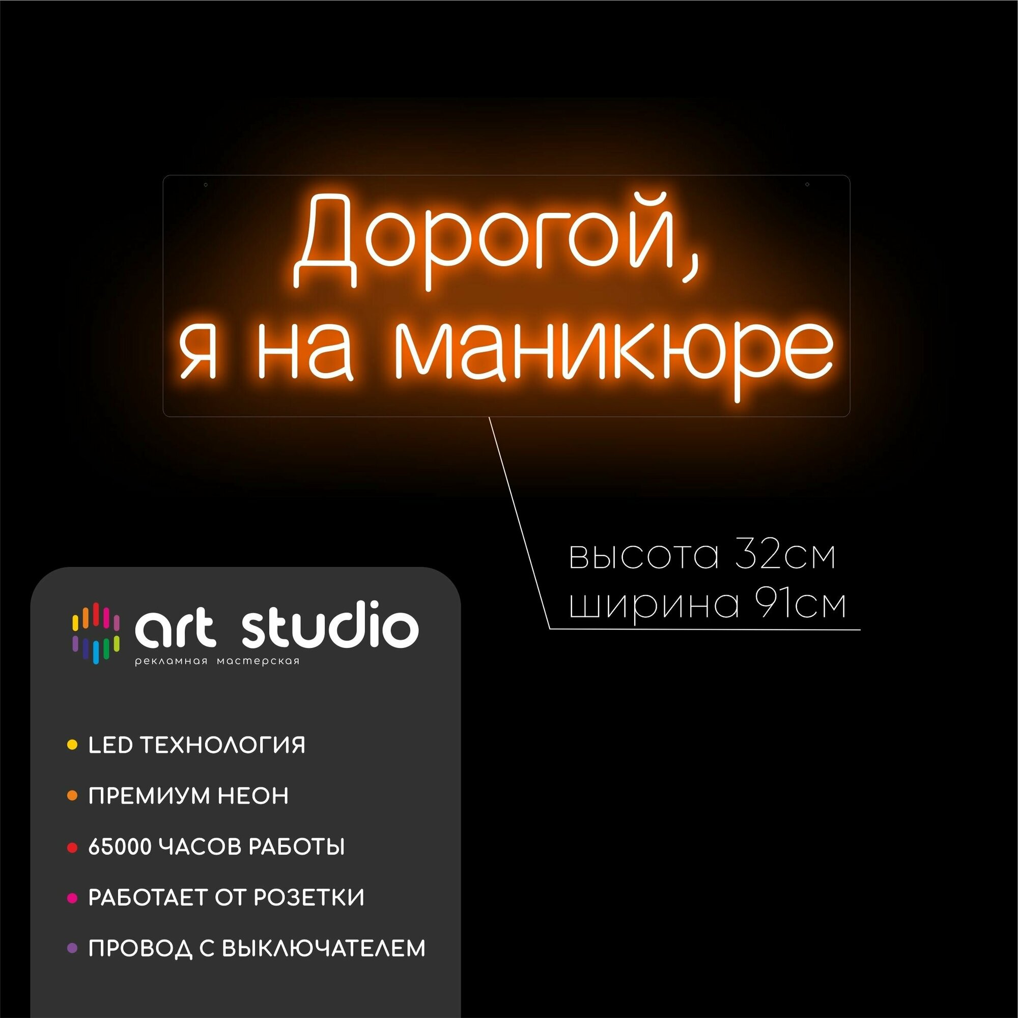 Неоновая вывеска "Дорогой, я на маникюре" — это стильный и функциональный элемент декора, который идеально подойдет для интерьера маникюрного кабинета, студии красоты или фотозоны. Лаконичная и узнаваемая фраза делает пространство запоминающимся и подчеркивает профессиональную деятельность мастера маникюра. Свечение стабильное и равномерное, безопасное для постоянного использования. Лёгкий монтаж и стандартное подключение позволяют быстро и без проблем установить вывеску в любом помещении.