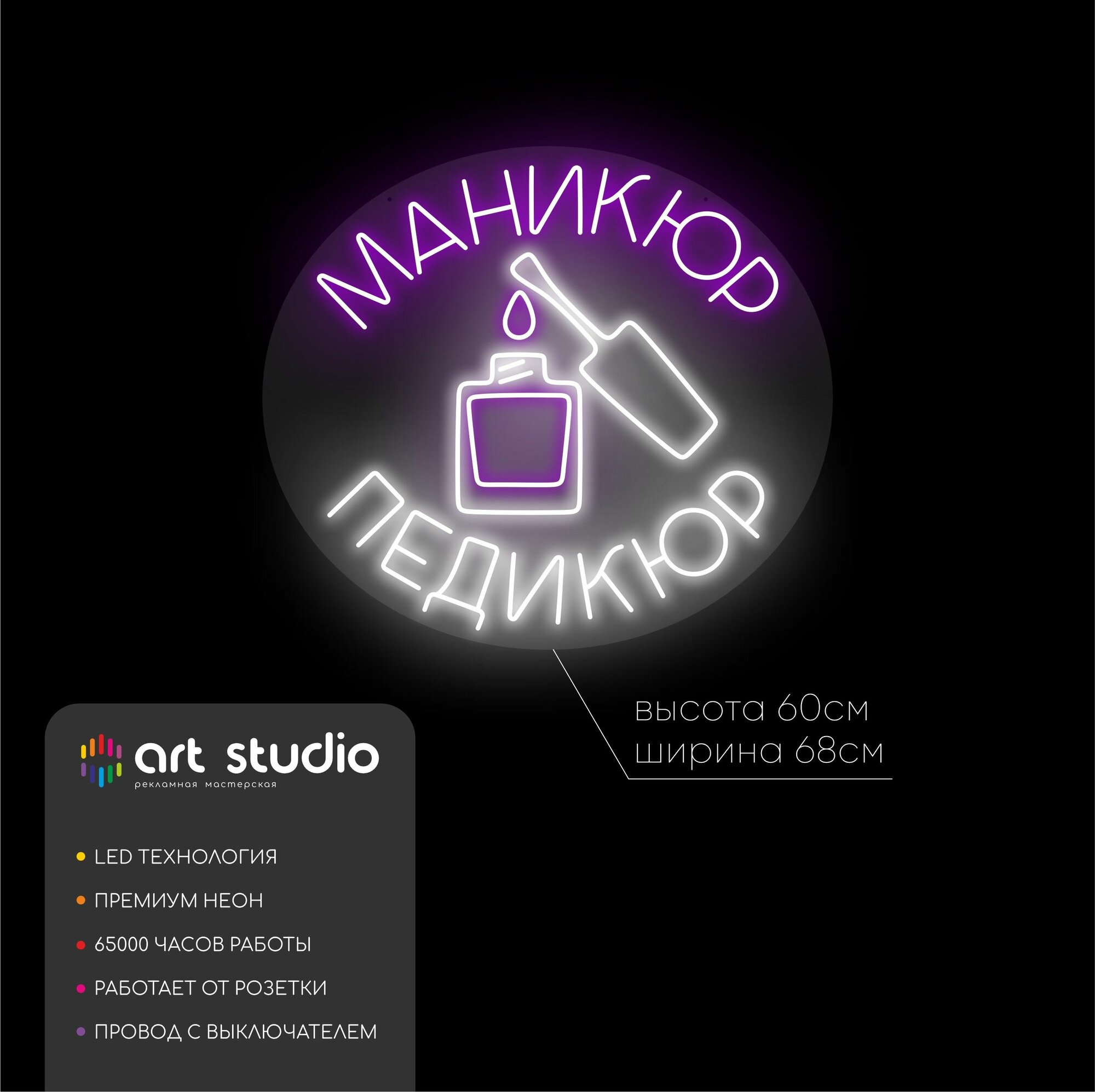 Неоновая вывеска "Маникюр и педикюр" — это стильный и функциональный элемент декора для салонов красоты, студий ногтевого сервиса и частных кабинетов мастеров. Четкая надпись сразу сообщает клиентам перечень услуг, служит световым ориентиром в интерьере и создает теплую атмосферу. Мягкое неоновое свечение привлекает внимание, особенно в условиях плохого освещения или витрины.