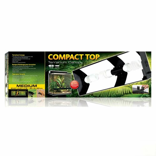 Компактный верхний навес Exo Terra — это компактный флуоресцентный навес для террариума, предназначенный для использования со стеклянным террариумом Exo Terra. Этот простой в установке навес подходит для компактных флуоресцентных ламп или ламп накаливания низкой мощности. Для создания идеального соотношения ультрафиолетового и видимого света можно использовать комбинацию различных компактных флуоресцентных ламп Exo Terra (например, Natural Light и Reptile UVB) или комбинацию с источником света накаливания, например, с лампой дневного нагрева для повышения температуры окружающего воздуха. Дополнительные аксессуары, такие как цифровой термометр Exo Terra, можно вставить в специальный выдвижной ободок в верхней части навеса.
