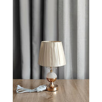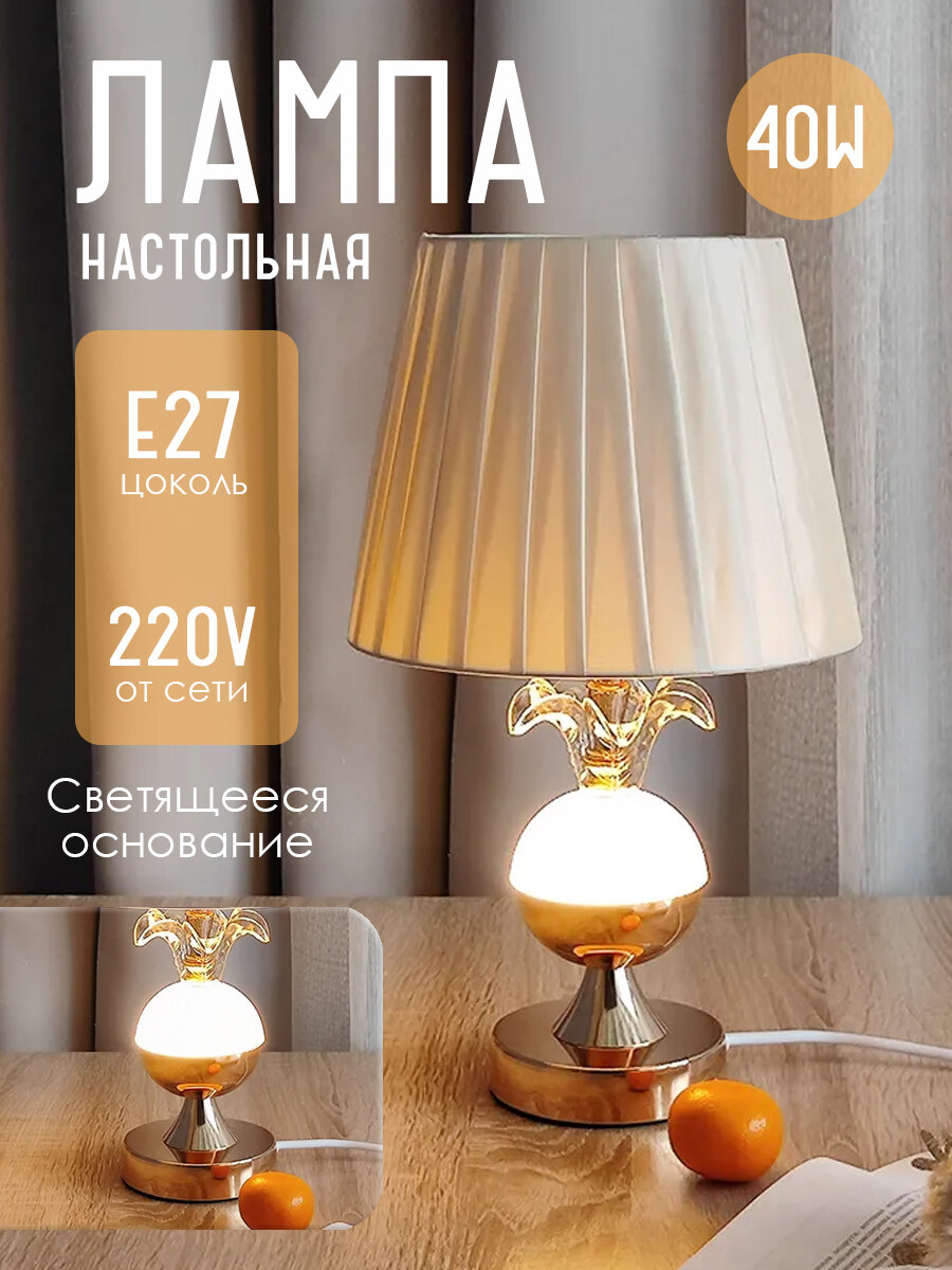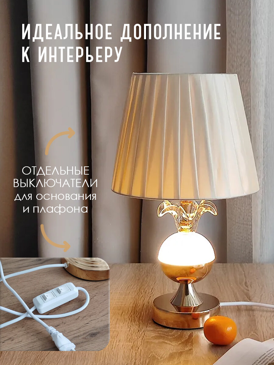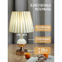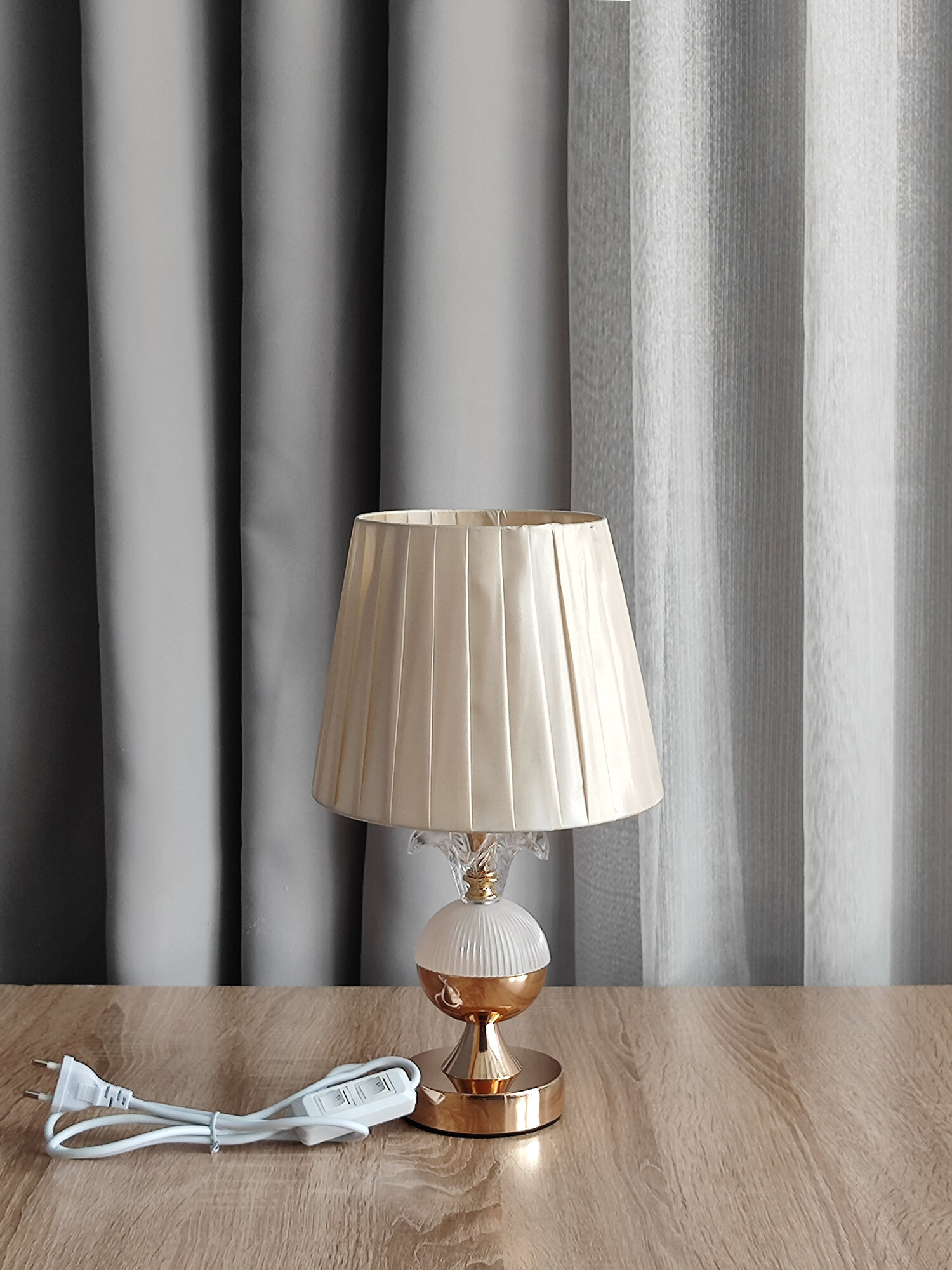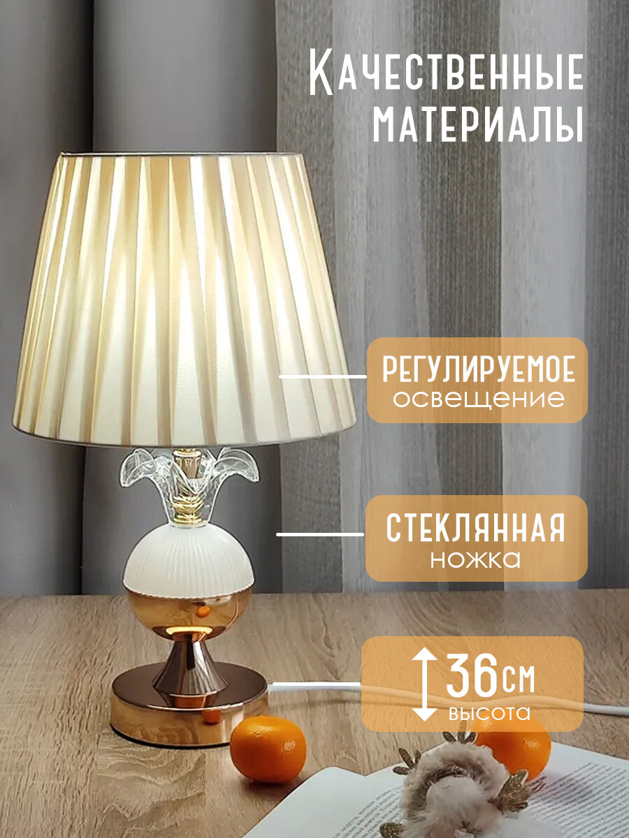 | Дополнительная информация | Габариты светильника (общая высота настольного светильника 36 см, длина провода 112 см). Диаметр верхней части абажура 15 см, а нижней – 21 см, высота абажура 17 см. |