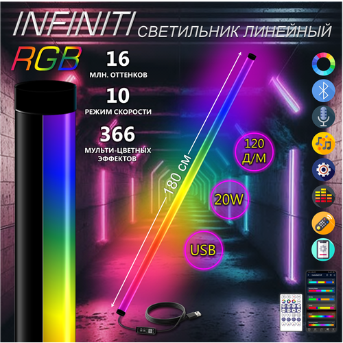 Линейные светильники RGB серии INFINITI – верное решение для тех, кто ищет надежный источник света. Они отлично подойдут в качестве дополнительной подсветки рабочих зон, кухни или витрин. Возможность управления через пуль ДУ до 10 штук позволяют использовать светильники в качестве основного света. Вы можете создать самые разнообразные варианты освещения, которые будут не только функциональными, но и декоративными. Например, подойдет для акцентной подсветки зеркал, картин и книжных полок. Яркий и равномерный свет особенно важен для рабочих зон. Управляются через пульт ДУ и через приложении на телефоне через Bluetooth.