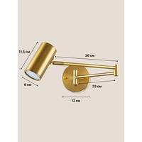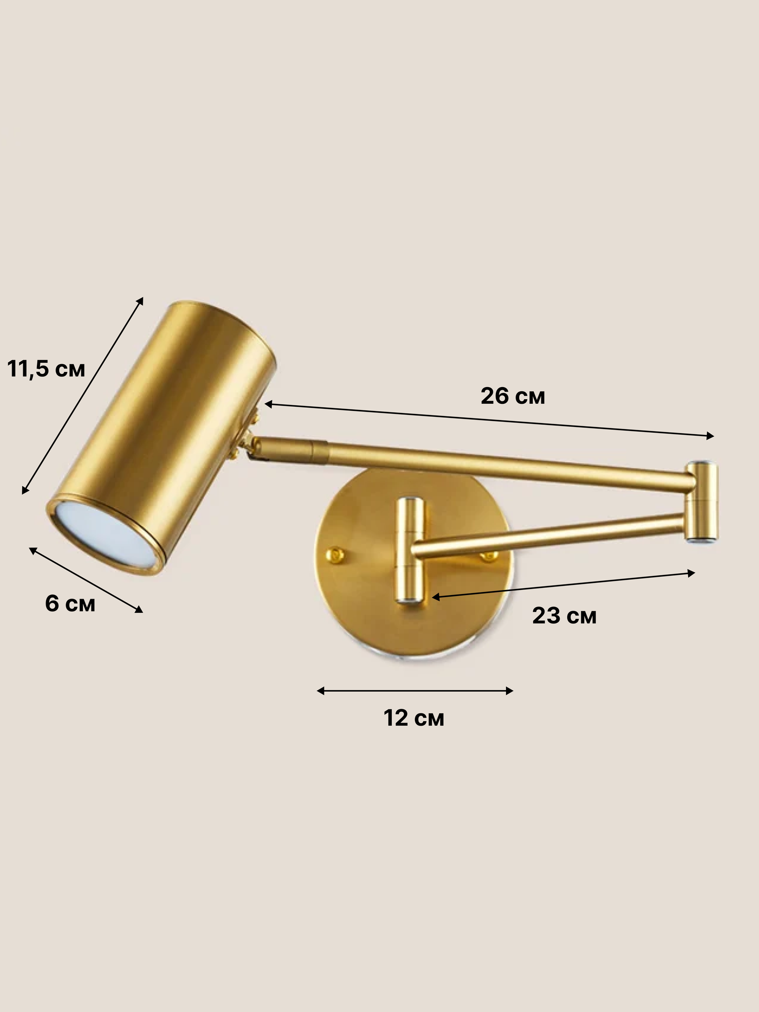 Светильник настенный на поворотной ножке – это отличное решение для создания уютной и стильной атмосферы в любом помещении. Он имеет площадь освещения 3 квадратных метра. Светильник выполнен в золотом цвете и имеет один плафон диаметром 6 сантиметров.