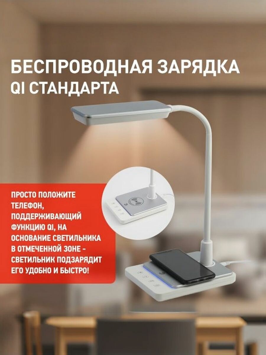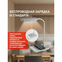 Светильник настольный для школьника поворотный на подставке 10Вт светодиодный сенсорный с беспроводной зарядкой для телефона ЭРА белый