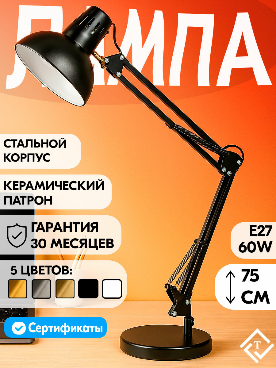 | Дополнительная информация | Основание (подставка): есть,Пантограф: есть,Форма основания: круглое,Диаметр основания: 19,Преимущества основания: Утяжеленное основание,,Преимущество пантографа: Лёгкая манёвренность и устойчивость,Диаметр арматуры пантографа, см: 1,Длина верхнего звена рамы пантографа, см: 33,Длина нижнего звена рамы пантографа, см: 33,Части стойки:: пантограф; ,,Цвет пантографа (палитра ТД Трансвит): Античная медь,Блеск пантографа: глянцевый,Цвет пружин на пантографе: черный,Цвет провода: черный,Цвет плафона: Античная медь,Блеск плафона: глянцевый,Длина от корпуса до выключателя, см: 26,Высота расположения выхода провода на корпусе, см: 6,Расположение выхода провода: низ,Преимущество расположения выхода провода: Расположение снизу исключит лишние акценты в интерьере,Род выключателя: ручной выключатель,Вид выключателя : механический,Особенности выключателя: включение-выключение ,Расположение выключателя: на проводе,Питание: от сети,Напряжение, В: 220,Вид питания OZON: От сети 220В,Форма плафона: Колокольчик,Длина плафона , см: 16,Диаметр плафона внутренний, см: 15,3,Расстояние от края цоколя до края плафона, см: 8,Свет OZON: RGB;Голубой;Дневной белый;Желтый;Зеленый;Золотой;Инфракрасный;Красный;Кремовый;Нейтральный белый;Оранжевый;Розовый;Синий;Теплый белый;Ультрафиолетовый;Фиолетовый;Холодный белый,Сборка (требуется?): есть,Количество этапов сборки: 2,Время сборки: 1 мин 42 сек,Преимущество веса: Низкий вес сэкономит время и усилия,Материал изделия (склейка): корпус - сталь; патрон - керамика,Декоративные элементы: отверстие для крепления к вертикальной поверхности;отверстия в верхней части,Наличие батареек в комплекте: батарейки не требуются; нет; не требует батареек,Лампочка в комплекте: лампочка приобретается отдельно,Для растений (критерий): есть,Комната: Кабинет; Офис; Спальня,Вид деятельности: для чтения; для ухода за собой - маникюра; для учебы; для работы; для хобби - вышивания, вязания,Стили интерьеров: классический;современный;хай-тек |
