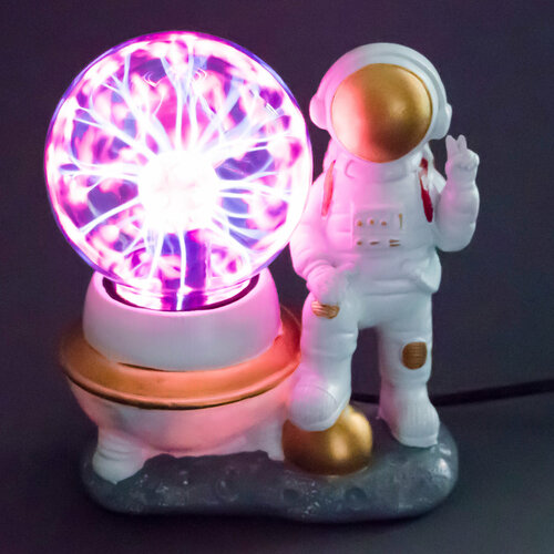 Светильник плазма в виде шара на подставке в виде звездного неба, ракеты и космонавта станет настоящим украшением любого интерьера дома / офиса и привлечет внимание гостей. Внутри прозрачной стеклянной сферы установлен электрод, к которому подается переменное напряжение. Внутри шара находится безопасный разряженный газ. При прикосновении к лампе возникают яркие электрические разряды, наполняющие помещение мягким разноцветным светом. Тысячи маленьких молний соединяются в единые потоки космической плазмы и устремляются к точке прикосновения. Это отличный способ показать детям, как работает электричество, и вызвать у них интерес к науке. Лампа настольная может быть использована для декорации интерьера, а также для научных экспериментов.