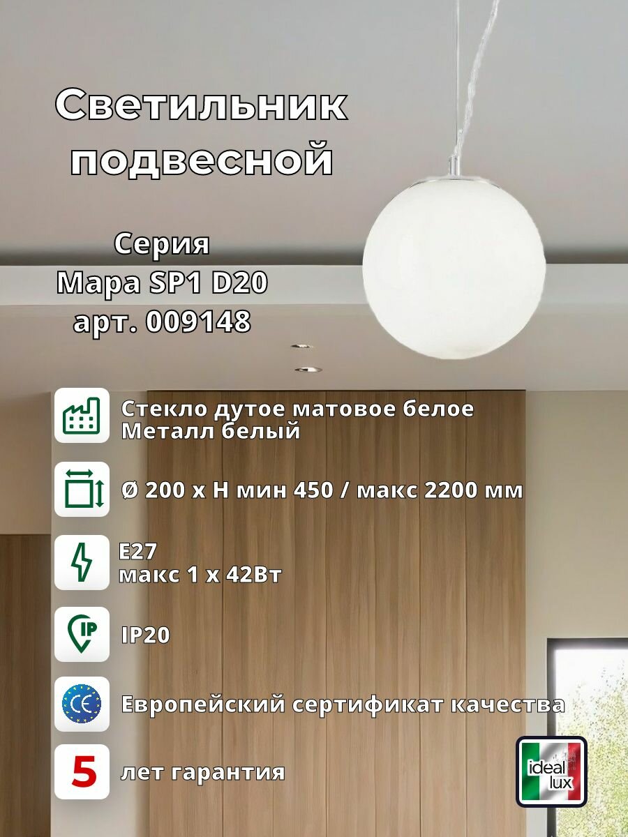 Светильник подвесной ideal lux Mapa SP1 D20 макс.1x60Вт IP20 E27 230В Белый Стекло/Металл Без лампы 009148.