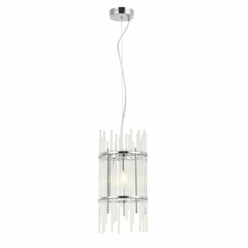 Одиночный подвес из серии Sia имеет металлическую арматуру, гальванизированную в цвет хрома и декорирован прозрачными стеклянными трубочками. Каркас подвесного светильника отделан металлическими кантами и дополнительно закрепленными металлическими стержнями, гальванизированными в цвет арматуры.