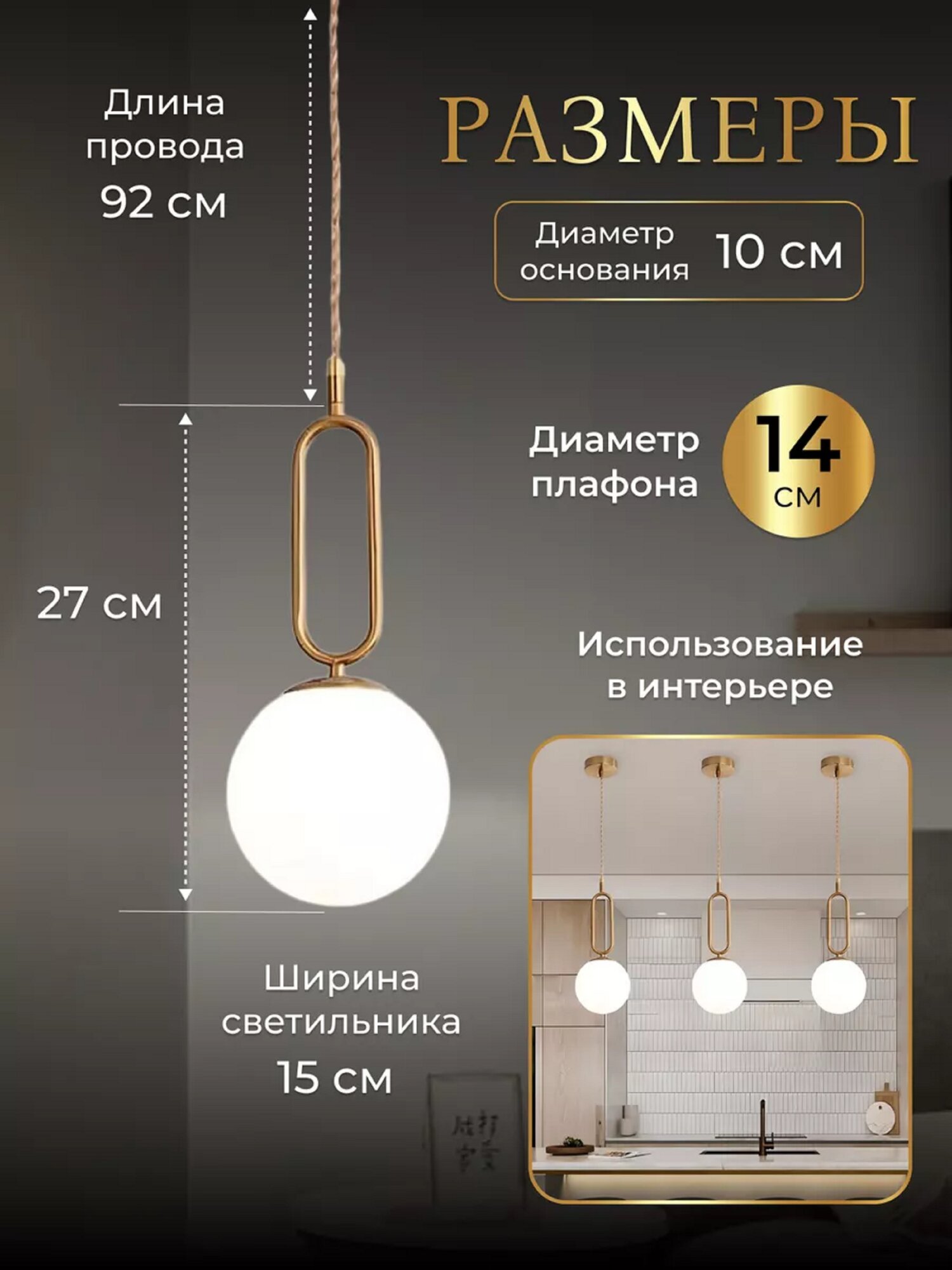 Светильник подвесной с шаром – это элегантное и функциональное решение для освещения вашего домашнего интерьера в доме, квартире или лофт пространстве. Он является идеальным выбором как для использования в качестве потолочного светильника на кухне над столом, так и как замена настенного бра около кровати. Благодаря своей универсальности, этот светильник легко адаптировать под любой тип помещения и дополнить имеющийся дизайнерский интерьер. Отлично сочетается с трековыми системами и спотами. Высота регулируется с помощью специального шнура, что позволяет подбирать оптимальное расстояние от потолка до освещаемой поверхности. Регулируемый трос крепится на круглое основание. Этот светильник напоминает небольшую потолочную люстру, но при этом имеет компактные габариты и не займет много места на вашем потолке. Выполнен в виде шарика в белом цвете и изгибами в золотом. Он выглядит просто и элегантно, идеально сочетаясь с различными стилями интерьера от классического до сканди, от модерна до лофта. Форма навесного хай-тек светильника удивит вас своей гармонией и создаст уютную атмосферу в вашем доме, в детской и зале. Кроме всего прочего, данный светильник использует лампочки с технологией led с цоколем Е27, что делает его освещение ярким и энергоэффективным. Питание от сети 220 В. Экономичное использование света позволит вам сэкономить на электричестве и обеспечить достаточный уровень освещения в вашем помещении. Ведь яркий и комфортный свет – это одно из ключевых условий для создания уютной и приятной атмосферы в доме. Монтаж этого красивого светильника очень прост и не вызовет у вас никаких трудностей. Крепится с помощью специальной металлической планки, находящейся внутри круглой накладной части и подходит для натяжных потолков. Благодаря качественному и надежному креплению светильник будет надежно фиксироваться и не будет вызывать тревоги во время использования. Обладая всеми необходимыми качествами, барный светильник является отличным выбором для тех, кто ищет стильное и функциональное решение для освещения своего интерьера. Подходит к мужскому и женскому дизайну, к комнате подростка и интерьеру кабинета для родителей, как настольная лампа, для кухни и офисного пространства, для маленькой прихожей и коридора. Независимо от того, какой стиль интерьера вы предпочитаете в спальне или гостиной, накладной потолочный стеклянный - акриловый светильник на подвесе будет гармонично вписываться в общую атмосферу вашего дома. Его модный современный дизайн в сферы с овалом в цвете золото над ним делают его универсальным выбором для любого помещения, отличным решением для офисного декора, оформления кафе и салона красоты, массажного и маникюрного кабинета. Он будет отлично смотреться над барной стойкой и кухонным столом. Попробуйте его сами и оцените все его преимущества! Подходит в качестве подарка для коллеги и начальника на новоселье в дом, для любимой мамы и любимого папы на день рождения, для бабушки и дедушки на юбилей, для подруги и друга на новый год и рождество, как новогодний сюрприз для взрослых и детей, подарок на день матери и отличное решение для женщин и мужчин. Работает от настенного выключателя.