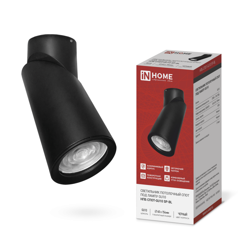 Светильник НПБ-СПОТ-GU10 SP-BL 60х154мм черный IN HOME предназначен для использования в различных помещениях, таких как гардеробная, ванная комната, бильярдная, бар, сауна, балкон, гостиная, детская комната, домашний кинотеатр, душевая, кабинет, кладовая, коридор, котельная, кухня, мансарда, мастерская, офис, прачечная, прихожая, санузел, столовая, студия, терраса, торговые помещения, холл и другие.