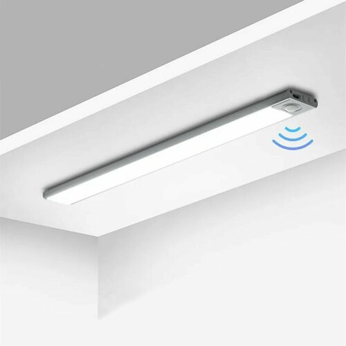 Светильник выполнен в виде узкой полосы, сбоку которой встроен датчик движения. Принцип работы светильника прост: если в радиусе работы датчика появляется объект – свет зажигается. Через 10-20 секунд после того как пропадает движение - светильник автоматически выключается. Также светильник можно переключить на режим постоянного свечения или выключить.