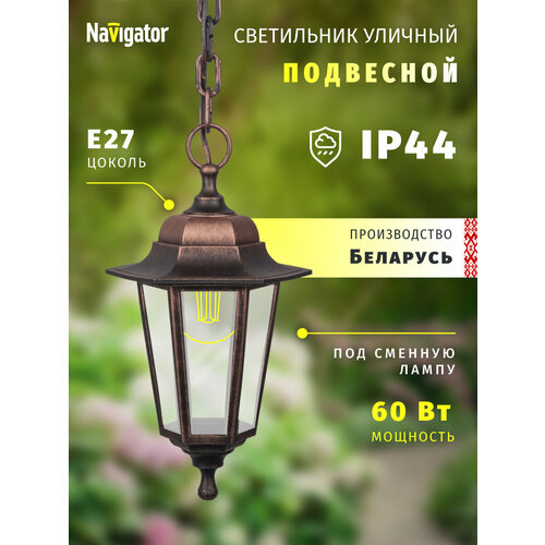 Светильник подвесной уличный Создайте уникальную атмосферу с декоративным ретро фонарём Navigator для освещения вашего дома, дачи, а также для веранды и других построек в саду. Этот навесной светильник в классическом стиле идеально подходит не только для уличного освещения фасада, но и станет отличным выбором для балкона, лоджии или даже коридора, гостиной или спальни, может использоваться для оформления кафе, ресторанов, декора зон отдыха. Светильник подвесной выполнен в старинном стиле, и имеет 6 граней, предполагает крепление под потолок. Установить наш садовый фонарь очень легко, все необходимое для монтажа – в комплекте. Корпус изготовлен из негорючего пластика (что обеспечивает безопасность использования) со стеклянными вставками. Для обеспечения надежности крепления стекол в корпусе светильника при необходимости можно применить клей. Уличный светильник не подвержен коррозии и имеет степень защиты от пыли и влаги IP44, работает от сети. Для корректной работы рекомендуется использовать лампу с цоколем Е27 и мощностью не больше 60 Вт, отлично подойдут энергосберегающие светодиодные лампочки или декоративные лампы, например филаментные или в форме свечи. Такой ландшафтный садово парковый светильник станет замечательным подарком или приятным презентом, ведь он идеально впишется в любой интерьер, как то: минимализм, лофт, винтаж, ретро и др. Сделано в Беларуси.