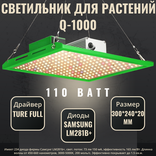 Профессиональный диммируемый светодиодный светильник, фитолампа Quantum board Q 1000. Питание от сети 220 Вольт, потребляемая мощность от 8 до 110 Ватт. Испускаемая 2500W, с регулировкой яркости Ture Full. Подойдёт для освещения рассады на подоконнике, в теплицах, полностью темных помещениях и для освещения больших растений в период цветения и развития плодов. Супер яркий и экономичный аппарат с высоким КПД. Размер алюминиевой площадки 300*240*20 мм. Оснащён качественным драйвером фирмы Ture Full, в алюминиевом корпусе. Имеет 234 диода фирмы Самсунг LM281b+, cвет. поток: 73 лм 150 мА, эффективность 165 лм/Вт. Длинна волны от 450-660 нанометров, 3000-5000К, 200 моль/с. Эффективно покрывает до 1.5 кв. м, безопасное расстояние 30 -150см, выше растений. Светильник оснащен диодами теплого дневного света, синими и красными. Срок службы диодов Самсунг 50 000 часов, без деградации. Будет работать как единственный источник света для растений в темных помещениях. Не требует дополнительного охлаждения кулером и, как следствие, более экономичен и не шумит. Наш светильник превосходит по параметрам известные аналоги, но не дорог по цене. Вы можете использовать данное устройство в любые периоды развития растений от рассады до цветения и плодоношения. Универсальное крепление позволяет разместить светильник в любом удобном месте. Будем благодарны за объективный отзыв о работе светильника.