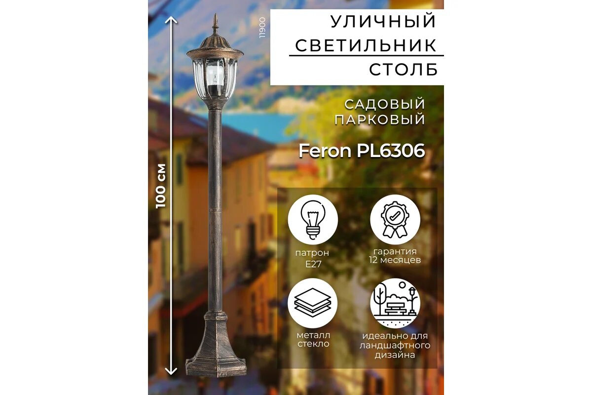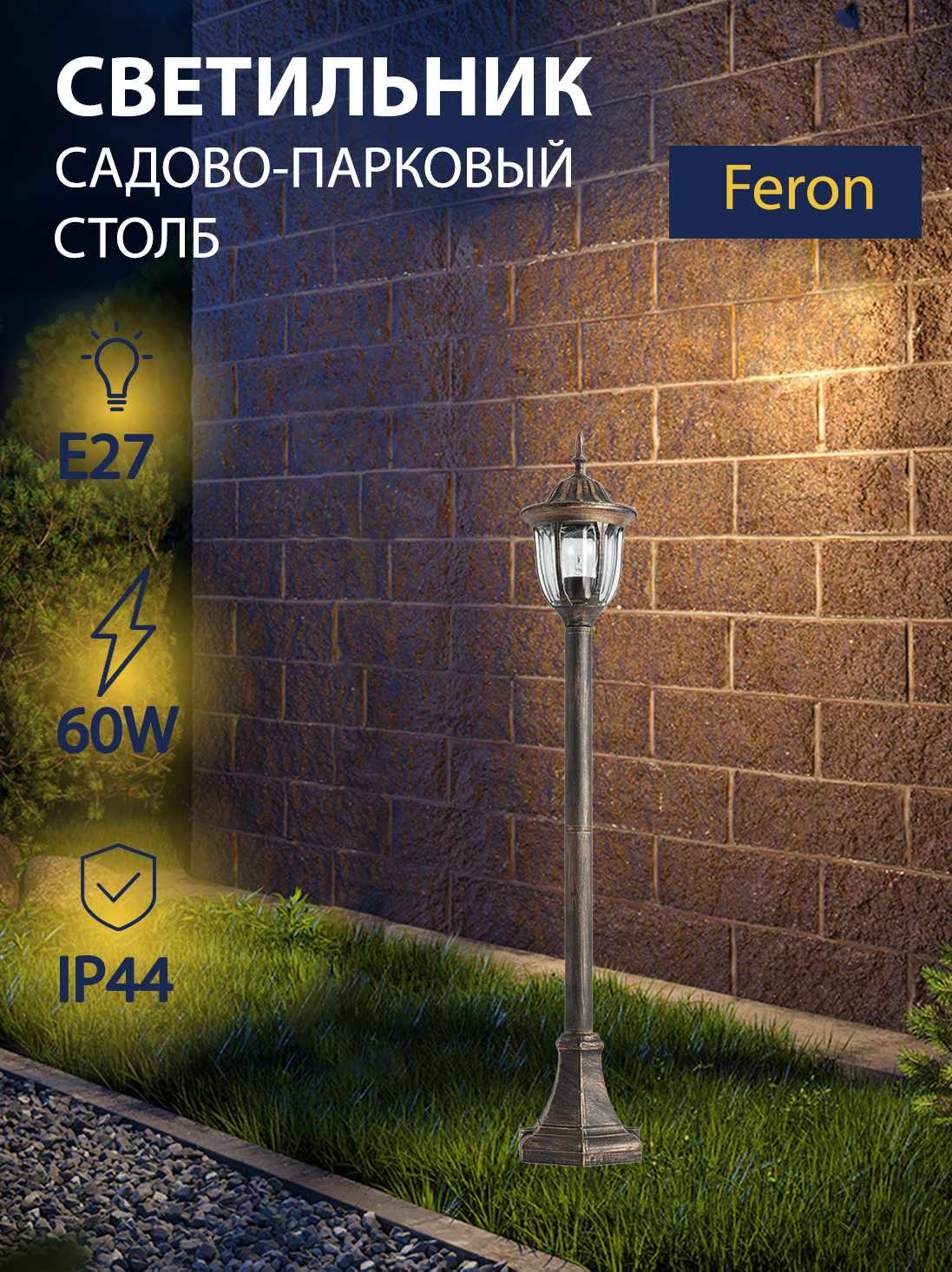 Светильник уличный садово-парковый, 60W, 230V, E27, IP44, черное золото, FERON PL6306 11900: сравнение цен, характеристики, фото, актуальное наличие и цены.
