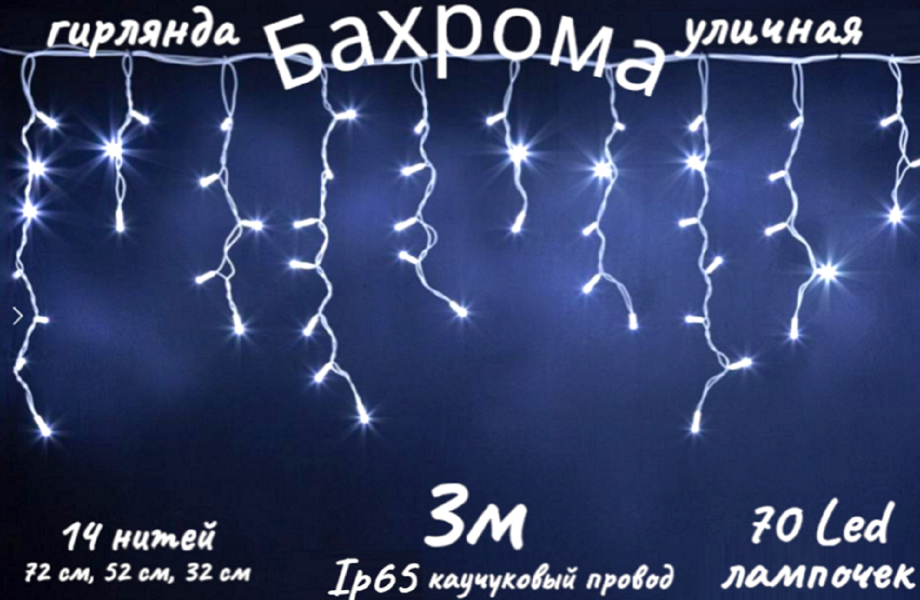 Гирлянда бахрома уличная, светодиодная 3х0.7 м.,с мерцанием, 180 LED/ 70 ламп, на белом проводе, обычно используется для оформления различных элементов зданий и ограждений: контуров крыш, козырьков, заборов, перил и т.д. Идеально подходит для суровых климатических условий с высокой влажностью и перепадами температур. Низкое электропотребление и увеличенный срок службы. Каучуковый провод.