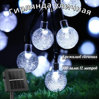 Светодиодная гирлянда на солнечной батарее - это декоративный светильник, состоящий из нескольких светодиодных ламп, использующих солнечную энергию. В лампе используются солнечные панели, которые могут преобразовывать солнечную энергию в электричество и хранить ее во встроенной батарее. Количество режимов работы 8, в том числе статичный, регулируются режимы на солнечной панели рядом с кнопкой включения. Гирлянда уличная пыле и влагозащищенная, не боится жары и морозов, работает и в дождь, и в снег. При полной зарядке батареи (зависит от времени года и длительности светового дня) держит заряд до 8 часов, что позволит вам наслаждаться светом диодов весь вечер и всю ночь. Светодиодная гирлянда заряжается днем от солнца и автоматически включается при наступлении сумерек. Длина гирлянды 10 м плюс 2 м провод до батареи, комплект состоит из: гирлянда нить, солнечная батарея, колышек для установки, встроенная аккумуляторная батарея по типу AA. Расстояние между диодами 10 см, всего 100 диодов. Размер шариков 2,4 см. Светодиодная гирлянда украсит любой праздник, а также подойдет в качестве подарка и для декорации фотозоны (фотосессии). Для корректной работы рекомендуем вначале зарядить солнечную батарею в течение дня на солнце (или другом источнике света). После чего она будет радовать вас свечением в темное время суток. Уличная гирлянда садовая может также использоваться дома, например, для украшения балкона или окна, для этого просто установите солнечную батарею на наиболее освещенном месте. Уличная садовая гирлянда станет настоящим волшебством, принесет радость и уют в ваш дом или сад в любое время года.