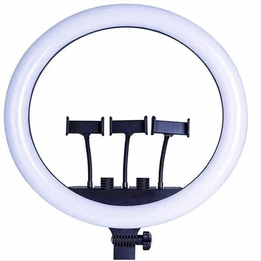 Кольцевая лампа с держателем для смартфона предназначена для настройки правильного света при проведении фотосессий, организации рабочего места визажиста стилиста при проведении макияжа, прическа и т. д. Основным преимуществом кольцевой лампы является отсутствие бликов и равномерное рассеивание света. Каждый специалист, в первую очередь, в этой кольцевой лампе, отметит возможность регулирования цветовой температуры и индекса цветопередачи, что в свою очередь делает ее более привлекательной для многих высококвалифицированных специалистов в различных областях, где требуется высококачественный свет. Естественно, при желании этот продукт можно приобрести не только в профессиональных целях, но и для домашнего использования, поскольку он имеет небольшой вес и компактность. Кольцевая лампа оснащена большим количеством лампочек и станет незаменимой как для домашнего использования, так и для осуществления собственной профессиональной деятельности в любой отрасли. В комплекте предусмотрены 3 держателя смартфонов на гибкой стойке с шаровой головкой. Держатели подходит для смартфонов шириной от 6 см до 8,5 см. Светодиоды, в зависимости от выбранного режима, осветят ваше лицо мягко и аккуратно, либо подарят студийную подсветку, или же, дадут освещение, подобное ярким софитам. Кольцевая лампа с держателями для телефонов отлично подойдет для селфи. Режимы подсветки и яркости настраиваются с помощью поворотных ручек или с помощью пульта управления, идущего в комплекте. На задней панели лампы предусмотрены два USB разъема для питания установленных смартфонов. НЕТ ультрафиолетового и инфракрасного излучения, низкая тепловая мощность, безопасность и защита окружающей среды, индекс цветопередачи - 90Ra. Штатив напольный с регулировкой высоты от 70 см до 210 см. Производитель оставляет за собой право изменения конструкции без ухудшения характеристик.