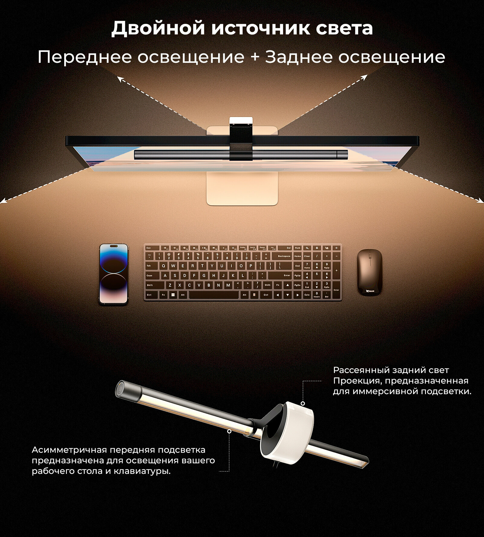 Светодиодная лампа для монитора Elesense Dual Light обеспечивает более захватывающее освещение. Передний и задний источники света уменьшают контраст между светом и тьмой в зоне прямой видимости.