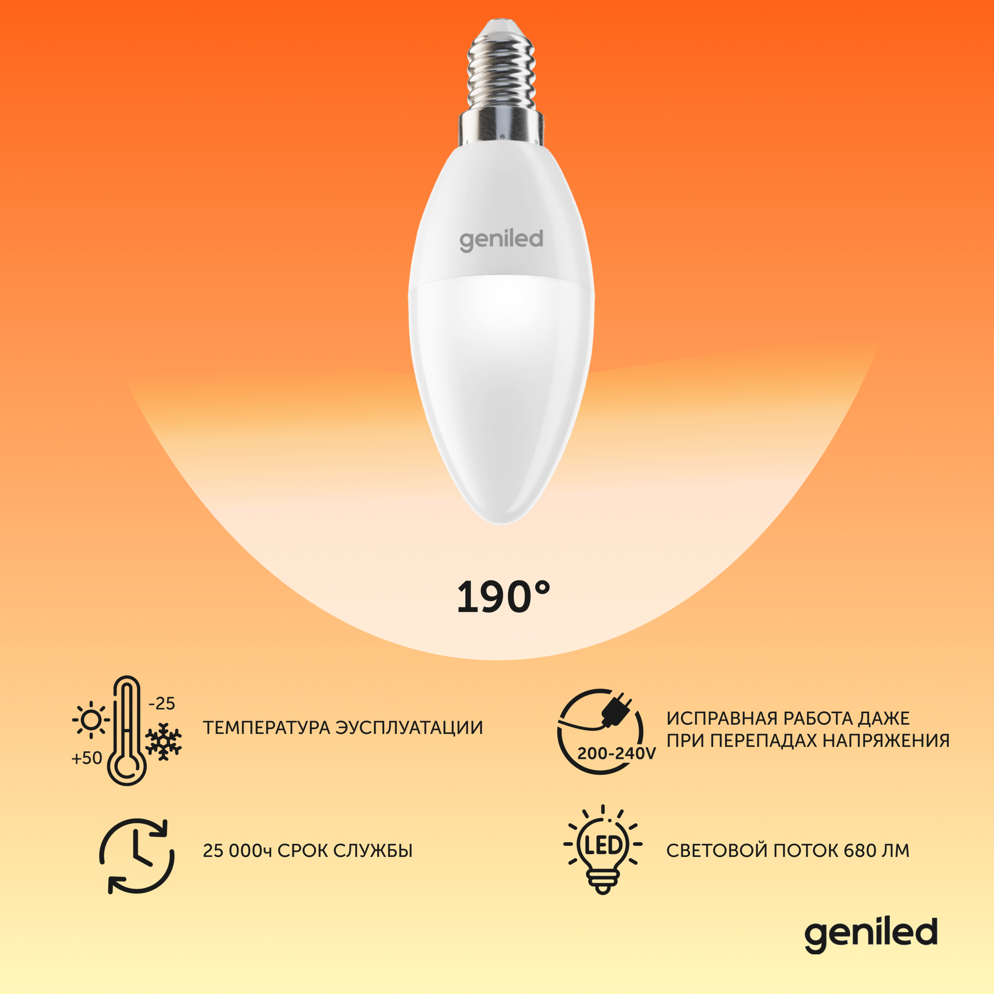 Светодиодная лампа Энергосберегающая Geniled E14 C37 9Вт 3000K 90Ra Свеча 10 шт: сравнение цен, характеристики, фото, актуальное наличие и цены.