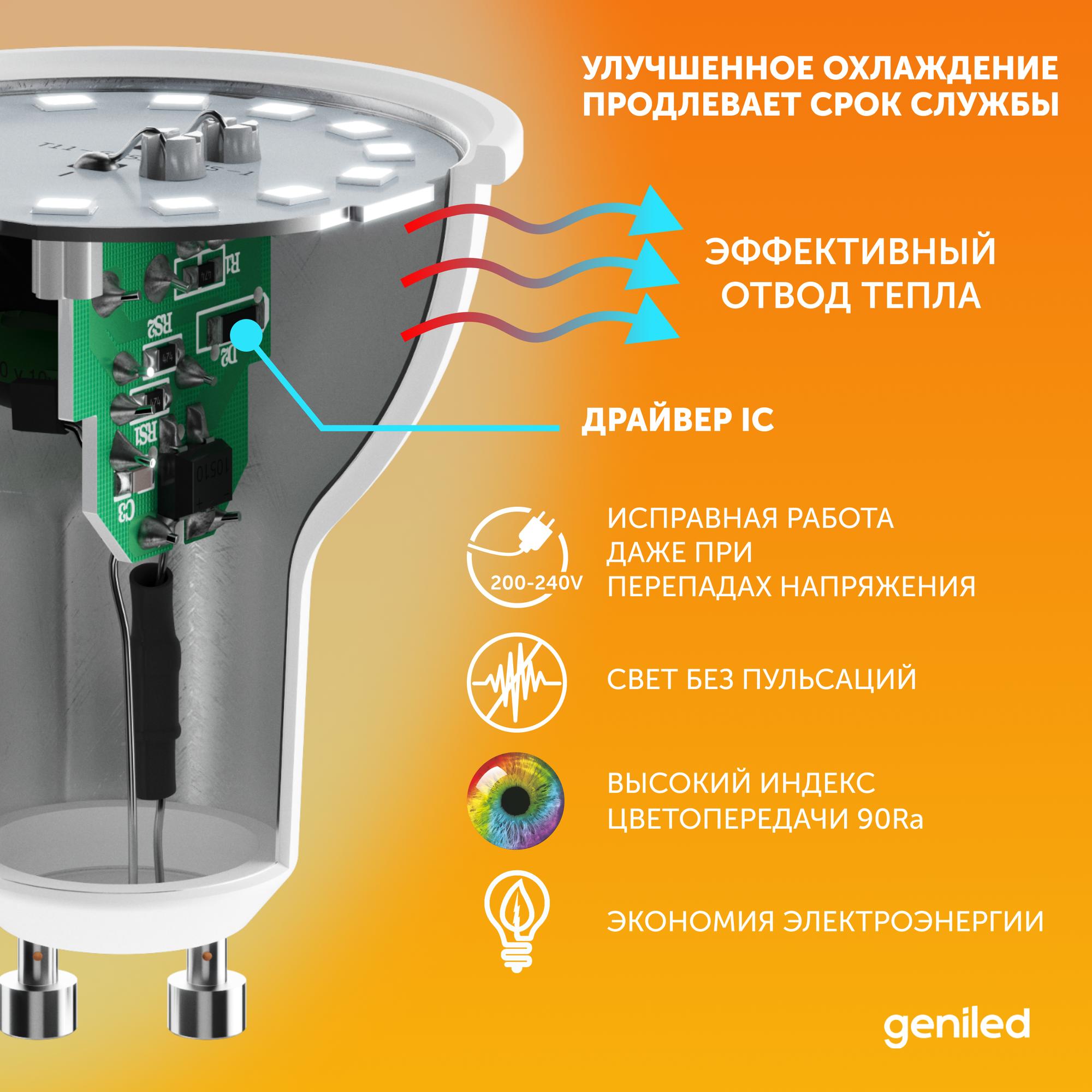 Светодиодная лампа Энергосберегающая Geniled GU10 MR16 9Вт 3000K 90Ra Софит 10 шт: сравнение цен, характеристики, фото, актуальное наличие и цены.