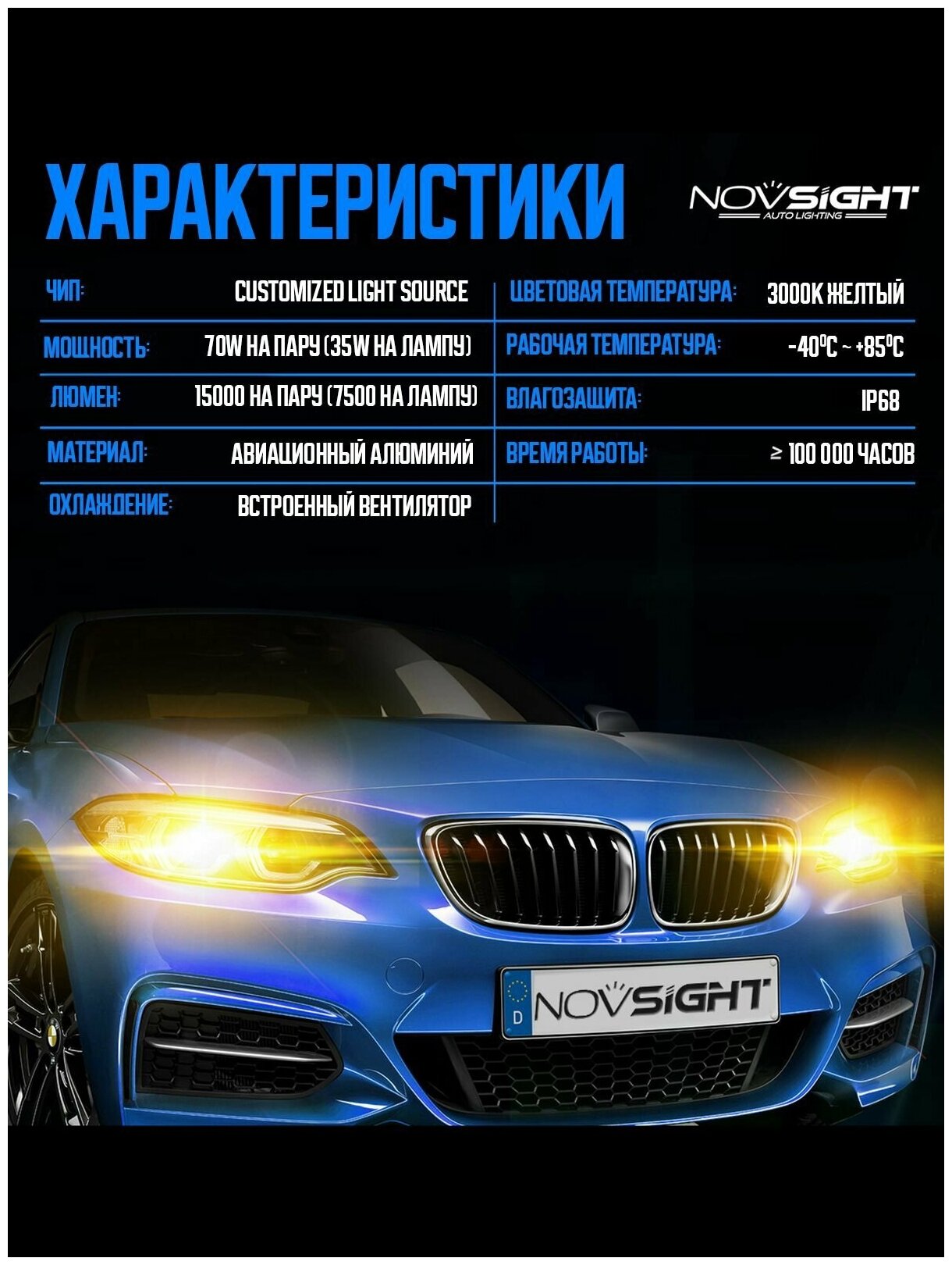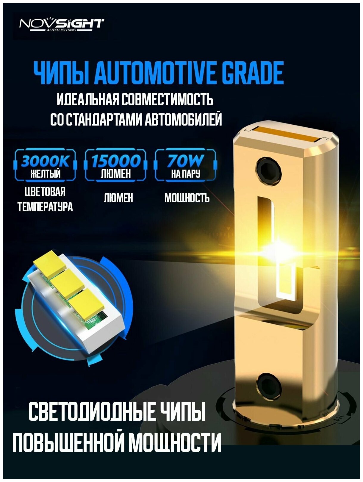 Светодиодная лампа Novsight F03Y HB3 9005 цоколь P20d 70Вт 2шт 3000K 15000Лм желтый свет LED автомобильная: сравнение цен, характеристики, фото, актуальное наличие и цены.