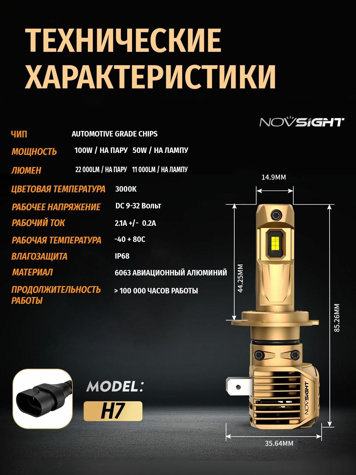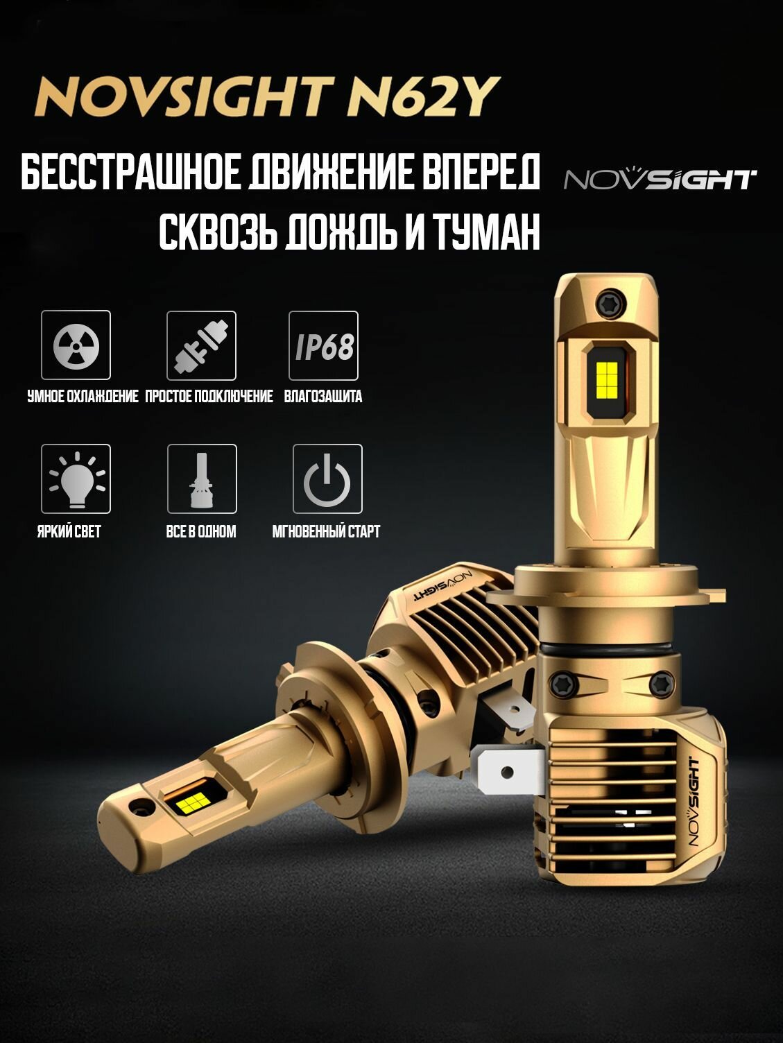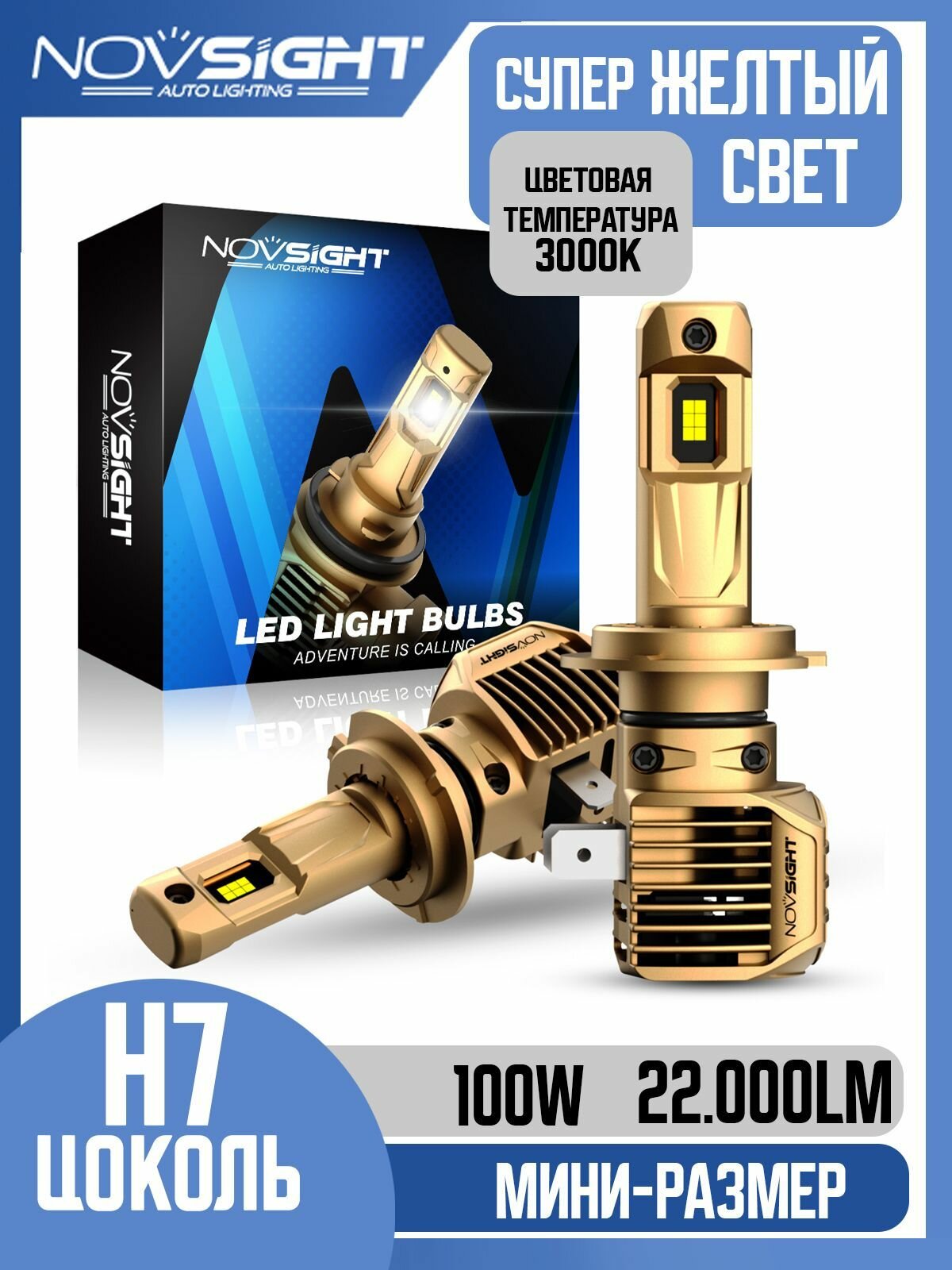 Светодиодная лампа Novsight N62Y H7 цоколь PX26d 100Вт 2шт 22000Лм 3000K желтый свет LED автомобильная: сравнение цен, характеристики, фото, актуальное наличие и цены.