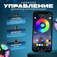 Лента имеет множество режимов работы, включая регулировку яркости, подсветку, таймер, будильник, скорость и режим переливания цветов. Также доступна функция "музыкальный режим", которая позволяет менять цвета в ритме музыки.