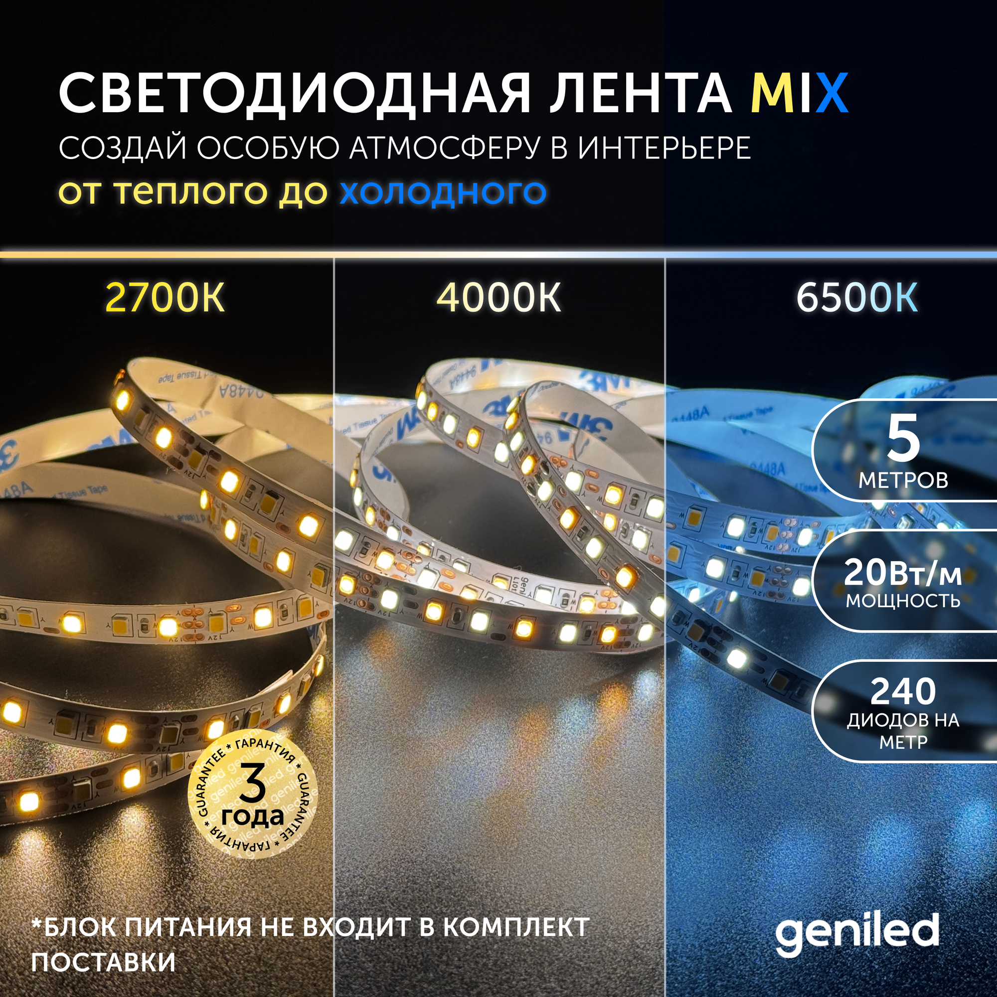 Светодиодная лента 5м 24В 20Вт/м 2700-6500К теплая и холодная CCT MIX подсветка 240 led/m IP33 10мм: сравнение цен, характеристики, фото, актуальное наличие и цены.