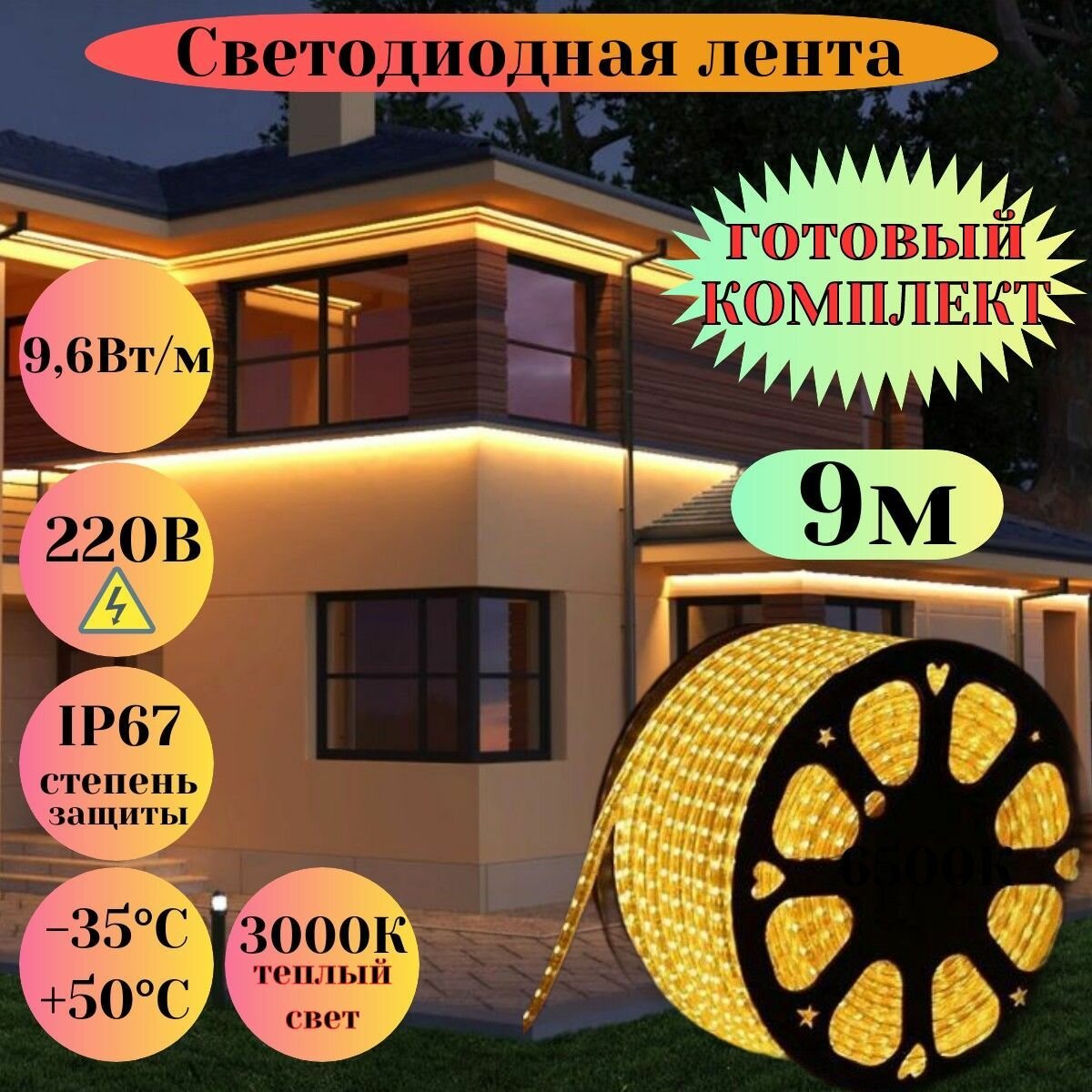 Светодиодная лента для уличного освещения 9м теплый жёлтый свет 220в гибкий неон для подсветки фасада дома кухни ресторана неоновая гирлянда в силиконе влагозащищенная морозостойкая led 3000к 9,6вт/м