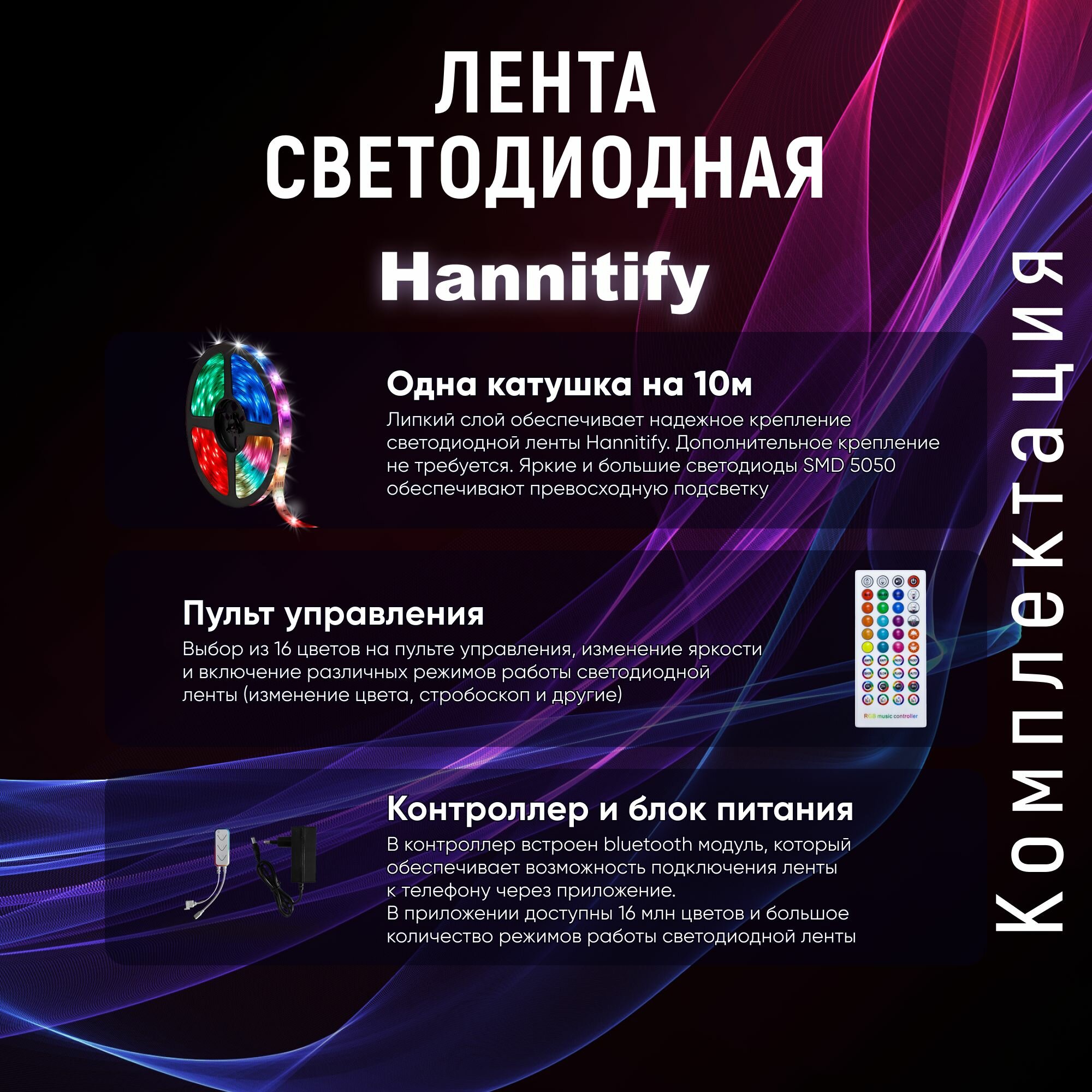 Светодиодная лента Hannitify 10м, 18 LED/m RGB, IP20, c Bluetooth, 12В (блок питания в комплекте), многоцветная, SMD5050. Управление цветом с пульта или телефона через Bluetooth. Свечение в ритм музыки: сравнение цен, характеристики, фото, актуальное наличие и цены.