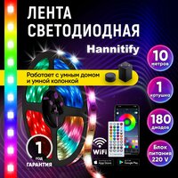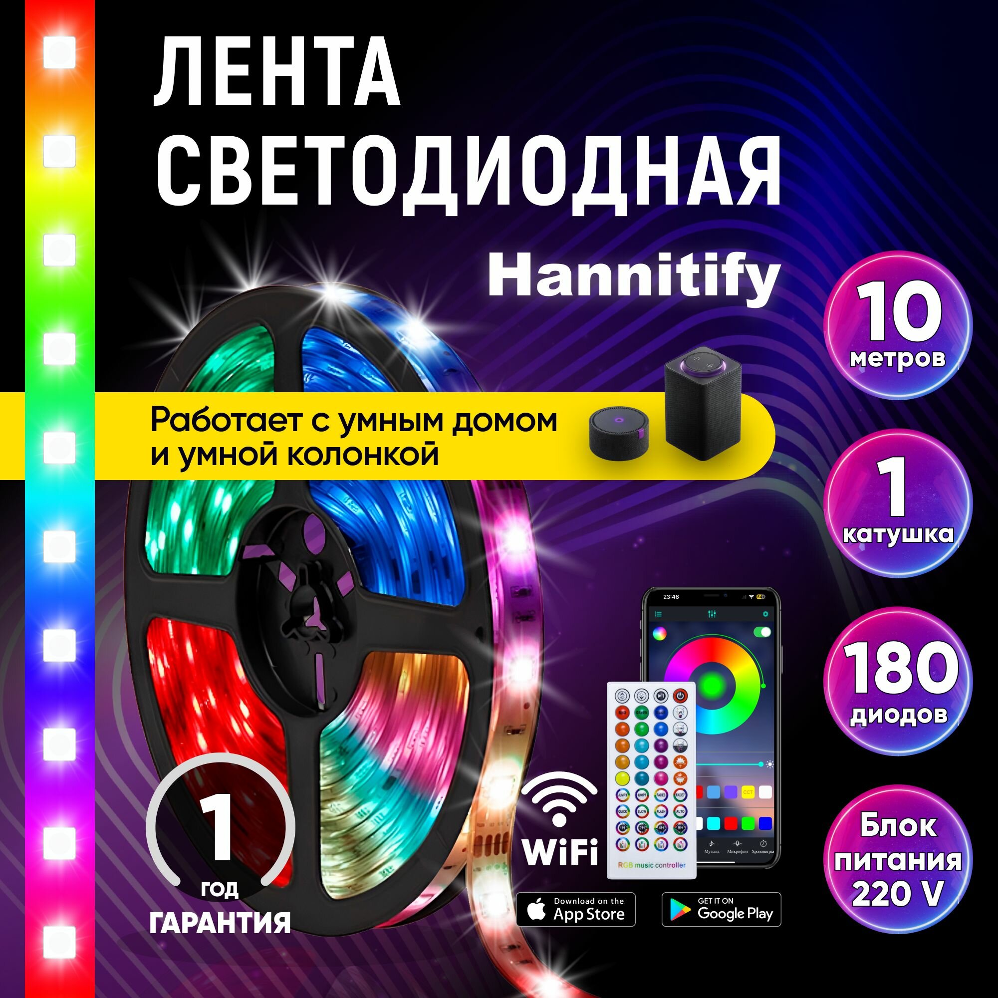 Светодиодная лента Hannitify 10м, 18 LED/m RGB, IP20, Wi-Fi, 12В (блок питания в комплекте), многоцветная, SMD5050, с Wi-Fi. Управление цветом с пульта и телефона. Работает по Wi-Fi с умным домом и умной колонкой, на платформе Tuya
