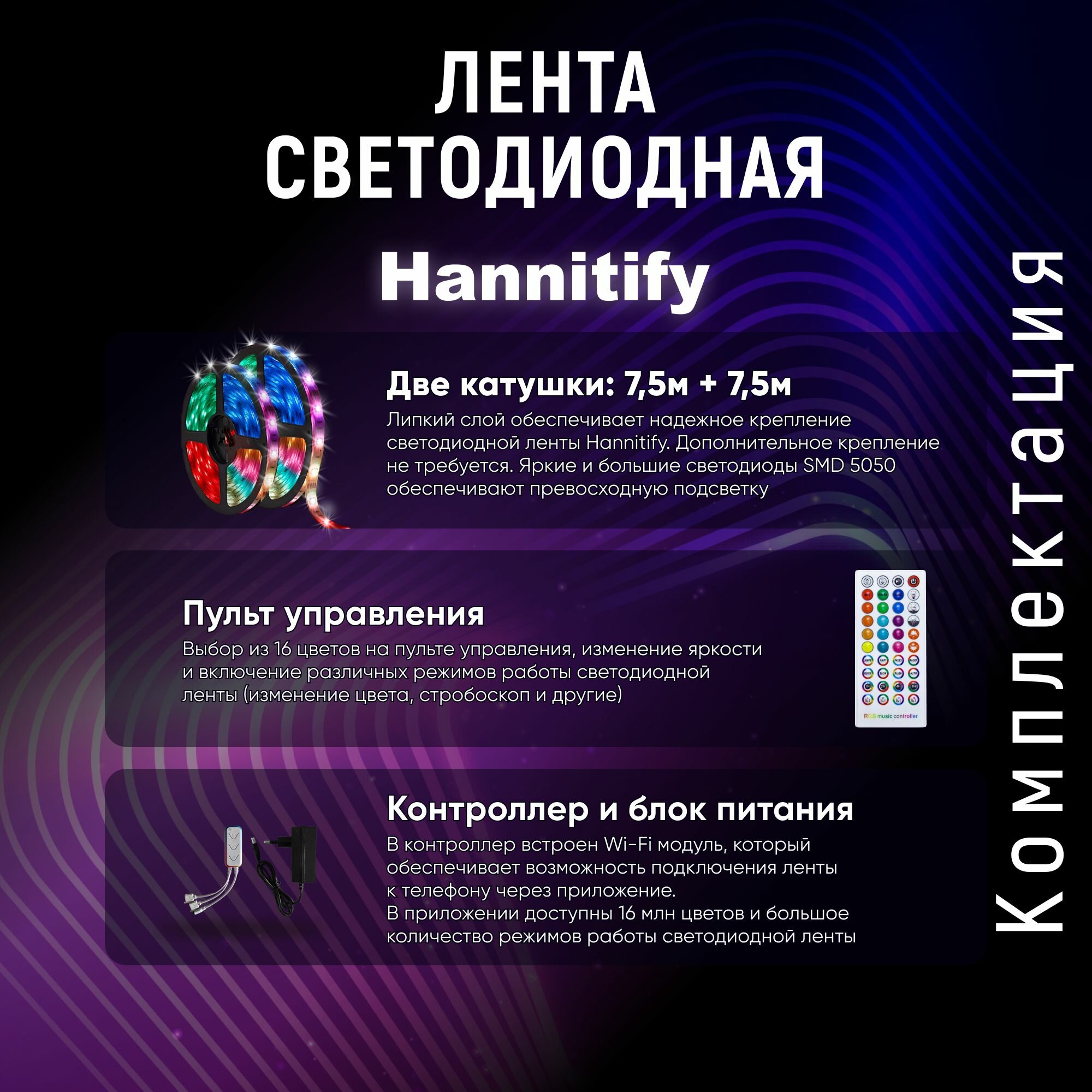 Светодиодная лента Hannitify многоцветная с пультом 15 метров RGB SMD5050 с Wi-Fi, не водонепроницаемая светодиодная гибкая лента постоянного напряжения 12 Вольт, с блоком питания. Светодиодная лента Hannitify RGB с контроллером Wi-Fi.