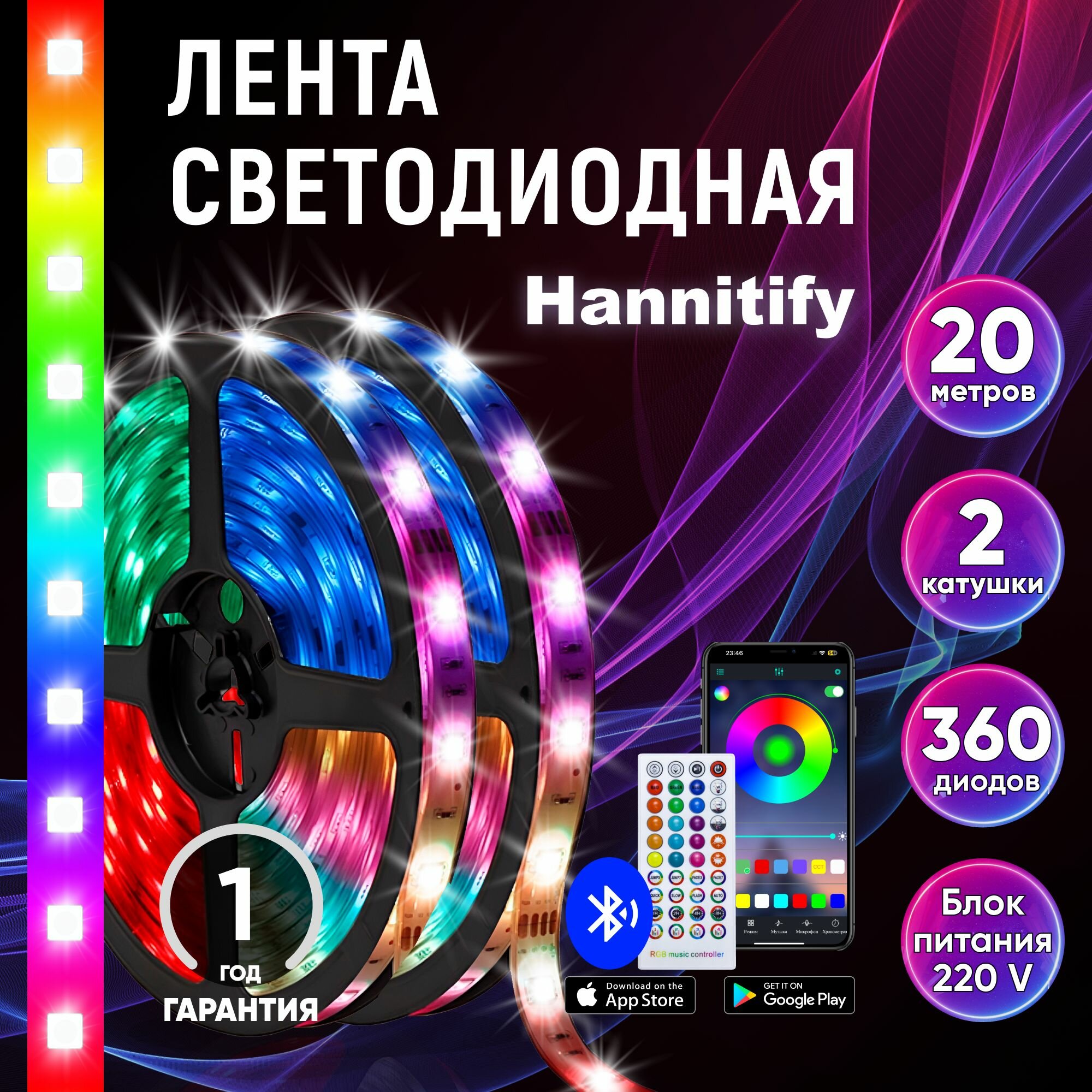 Светодиодная лента Hannitify 20м (10м+10м), 18 LED/m RGB, IP20, c Bluetooth, 12В (блок питания в комплекте), многоцветная, SMD5050. Управление цветом с пульта или телефона через Bluetooth. Свечение в ритм музыки: сравнение цен, характеристики, фото, актуальное наличие и цены.