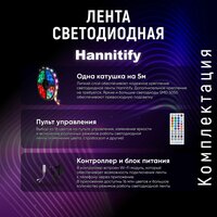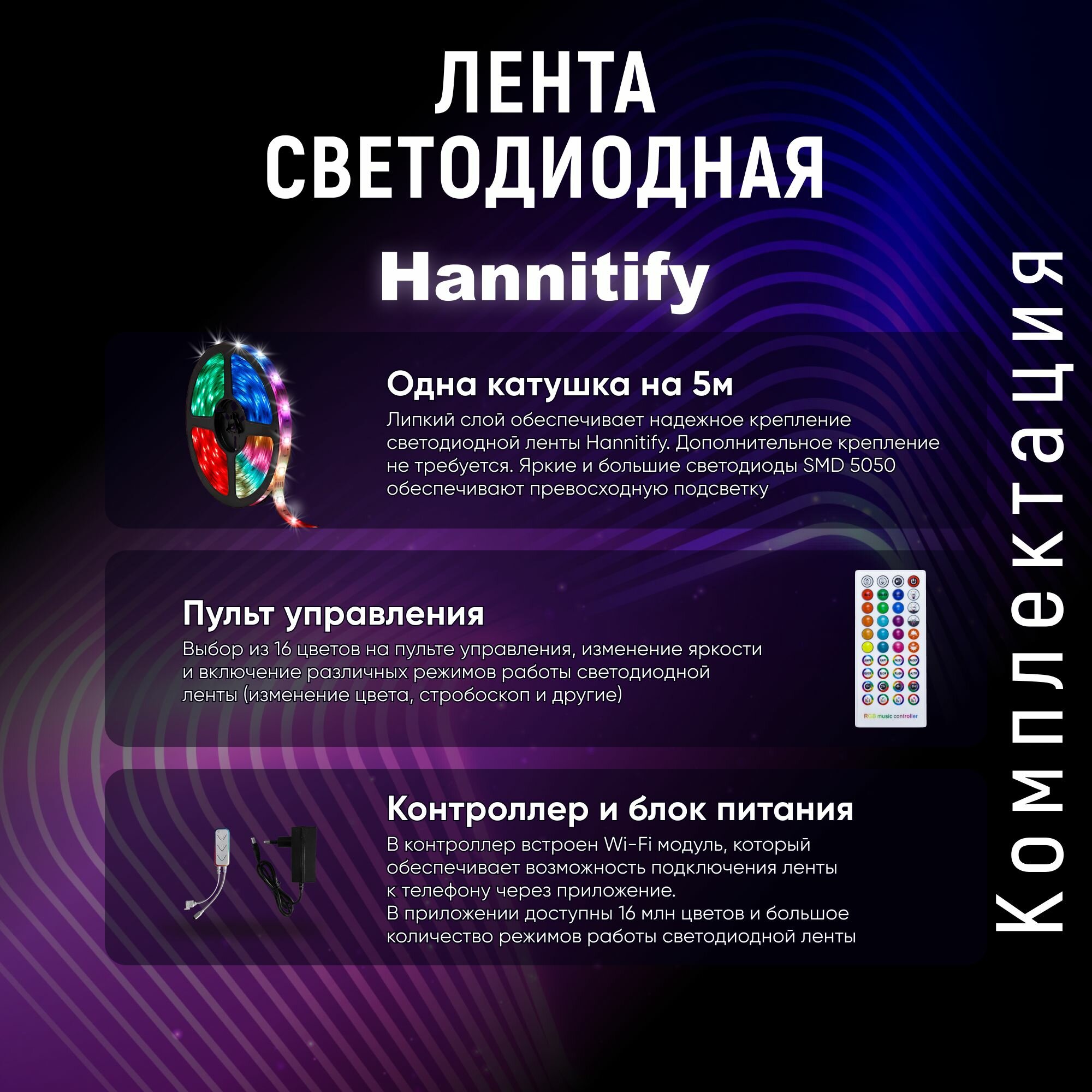 Светодиодная лента Hannitify 5м, 18 LED/m RGB, IP20, Wi-Fi, 12В (блок питания в комплекте), многоцветная, SMD5050, с Wi-Fi. Управление цветом с пульта и телефона. Работает по Wi-Fi с умным домом и умной колонкой, на платформе Tuya