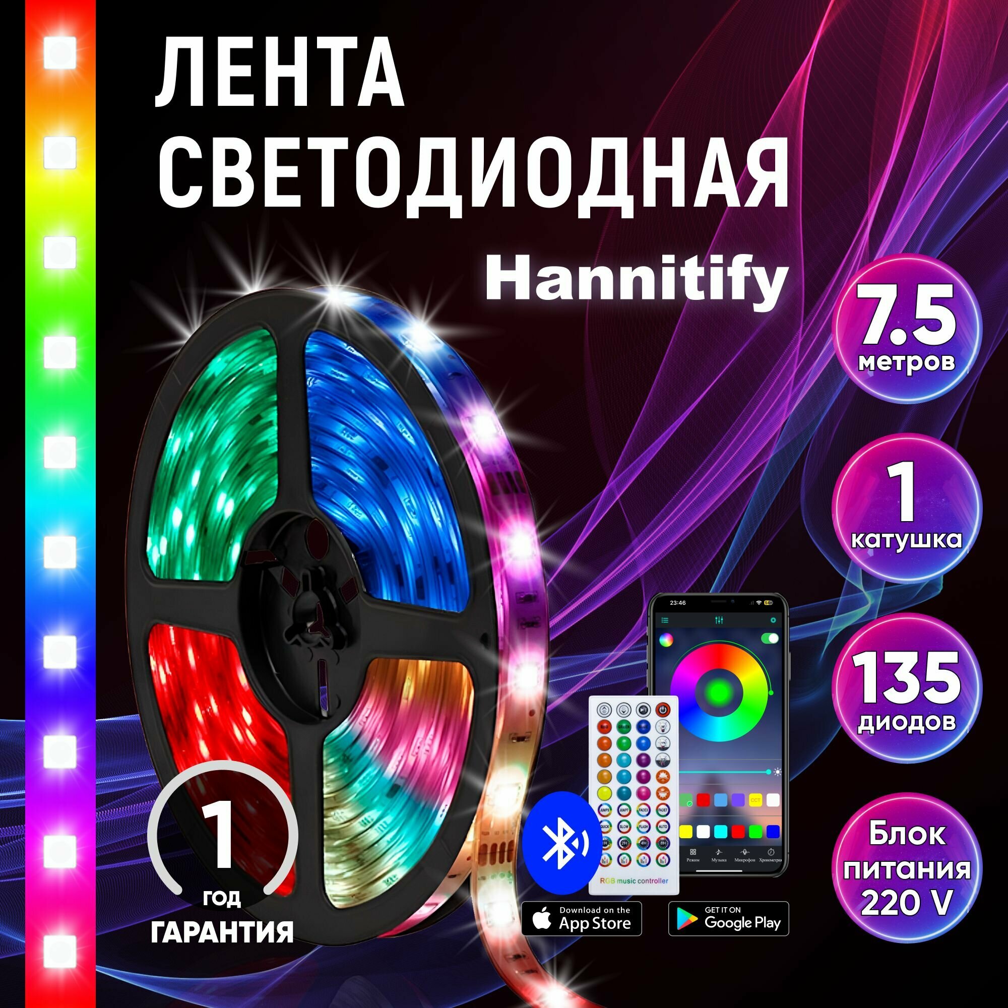 Светодиодная лента Hannitify 7,5м, 18 LED/m RGB, IP20, c Bluetooth, 12В (блок питания в комплекте), многоцветная, SMD5050. Управление цветом с пульта или телефона через Bluetooth. Свечение в ритм музыки: сравнение цен, характеристики, фото, актуальное наличие и цены.