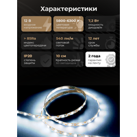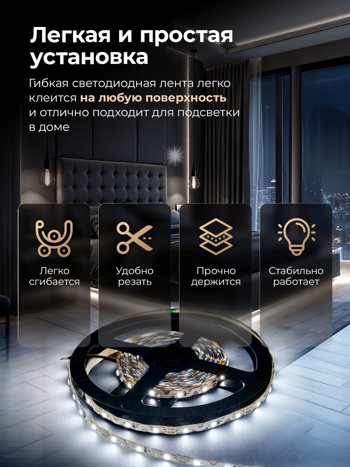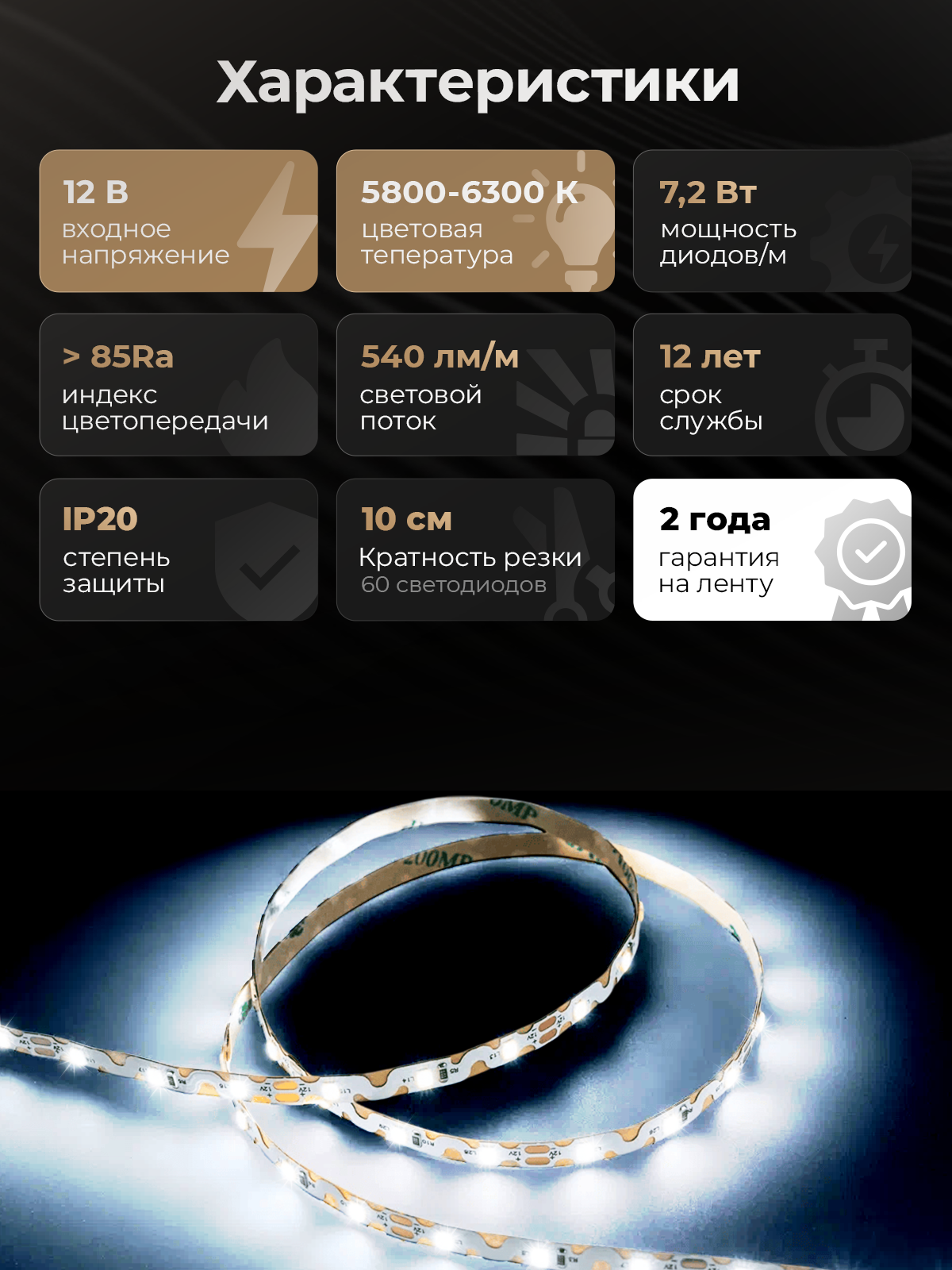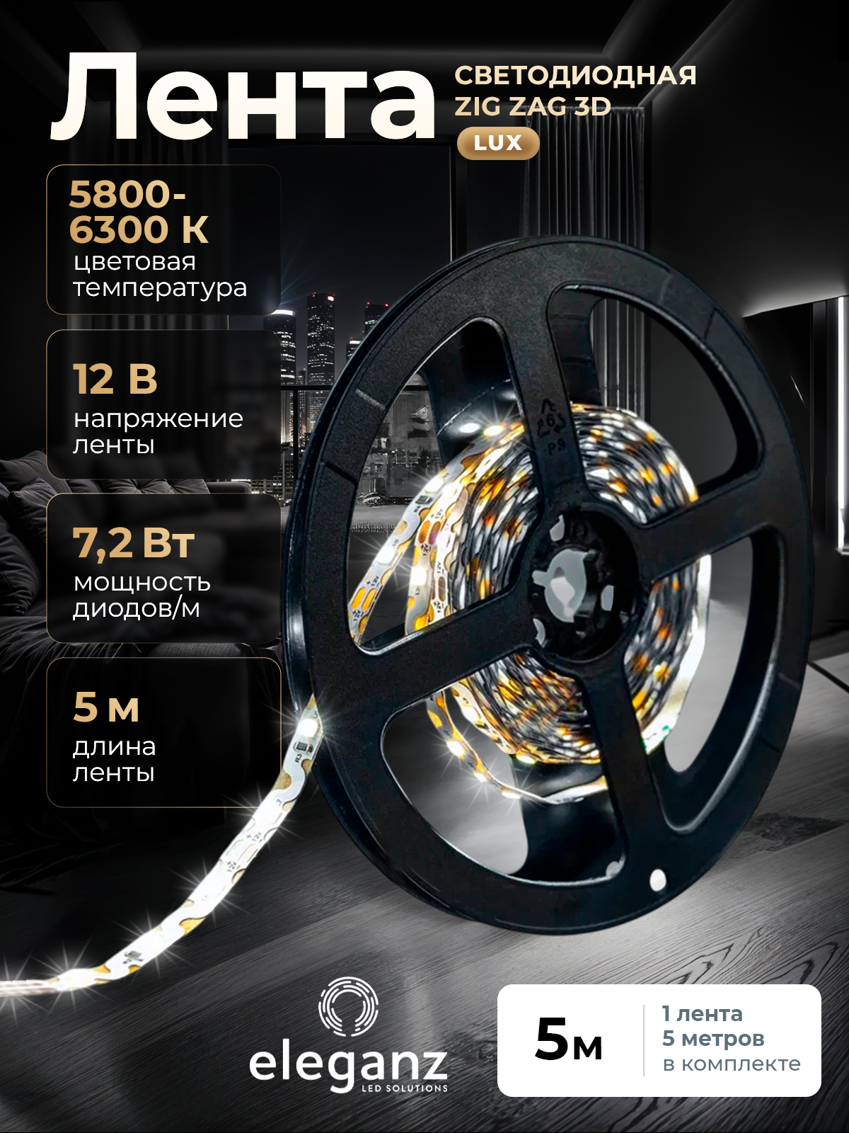| Подробная комплектация | Светодиодная лента LUX "Eleganz 12V" 7,2 Вт 2835, 60 LED, IP20 Холодный белый свет (ZigZag 3D), 5м. - 1шт., с проводами с двух сторон |