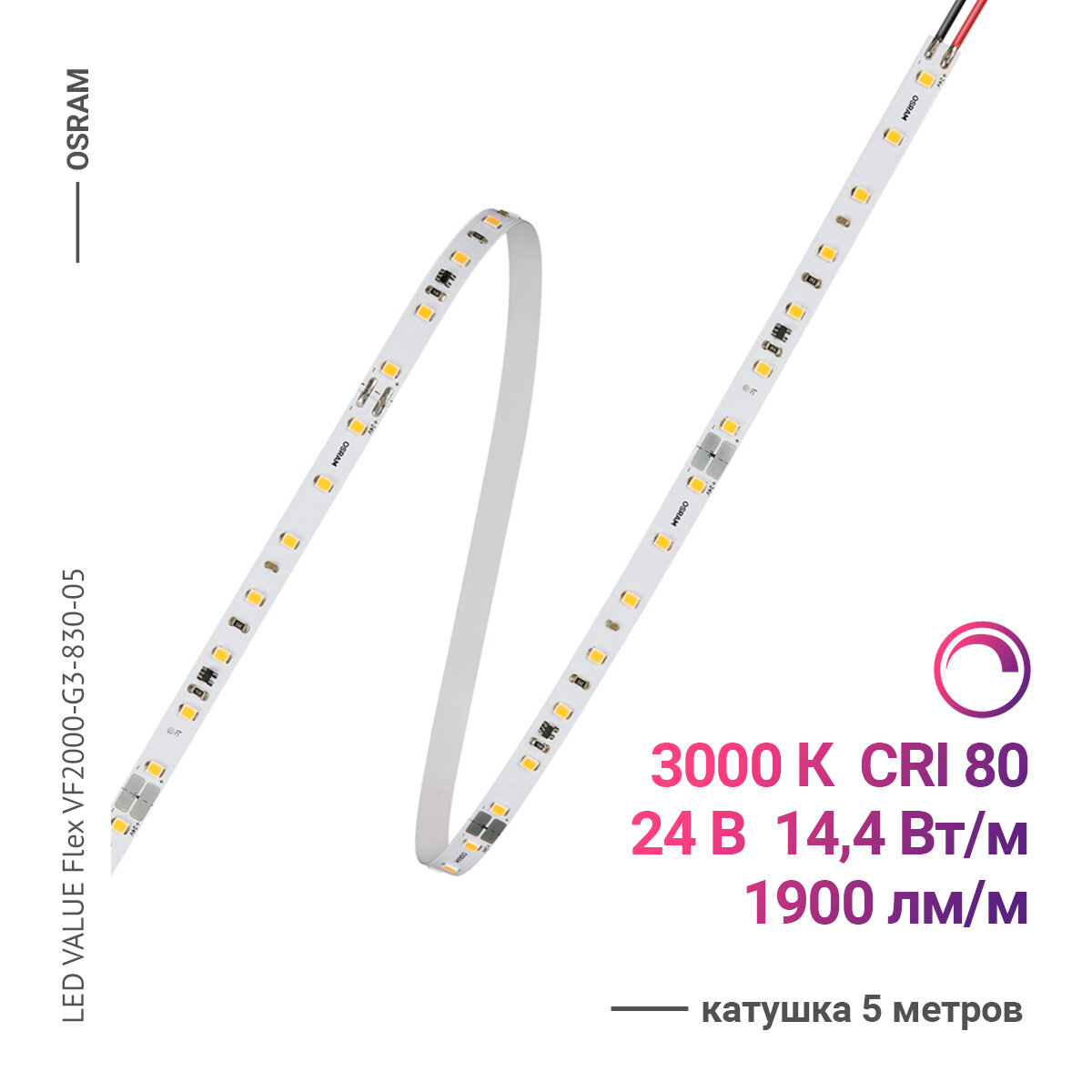 Светодиодная лента OSRAM VF2000-G3-830-05, Теплый белый свет, длина 5 м, 3000 К, 24 В, IP20, 70 LED/m: сравнение цен, характеристики, фото, актуальное наличие и цены.