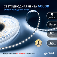 Светодиодная лента, подсветка Geniled — для комнаты, в гардероб, на кухню — Холодный белый свет / GL-120SMD2835 / 1250 Лм/м / 12В / длина — 5м / B — 8 мм / W — 12Вт / 6500 К / IP33