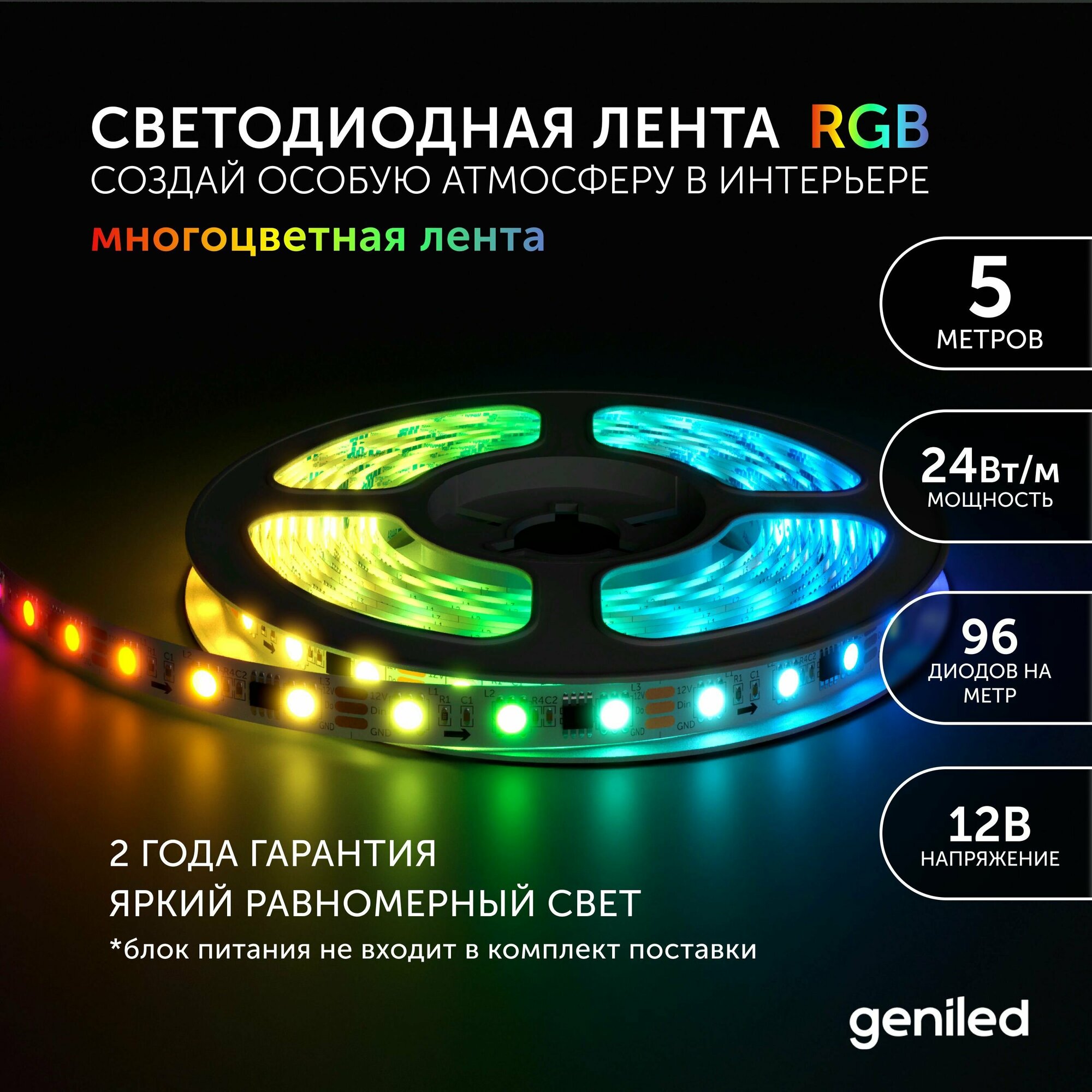 Светодиодная лента, подсветка Geniled — для комнаты, в гардероб, на кухню — Разноцветный свет / GL-96SMD5050 / 12В / длина — 5м / B — 10 мм / W — 24Вт / RGB / IP33